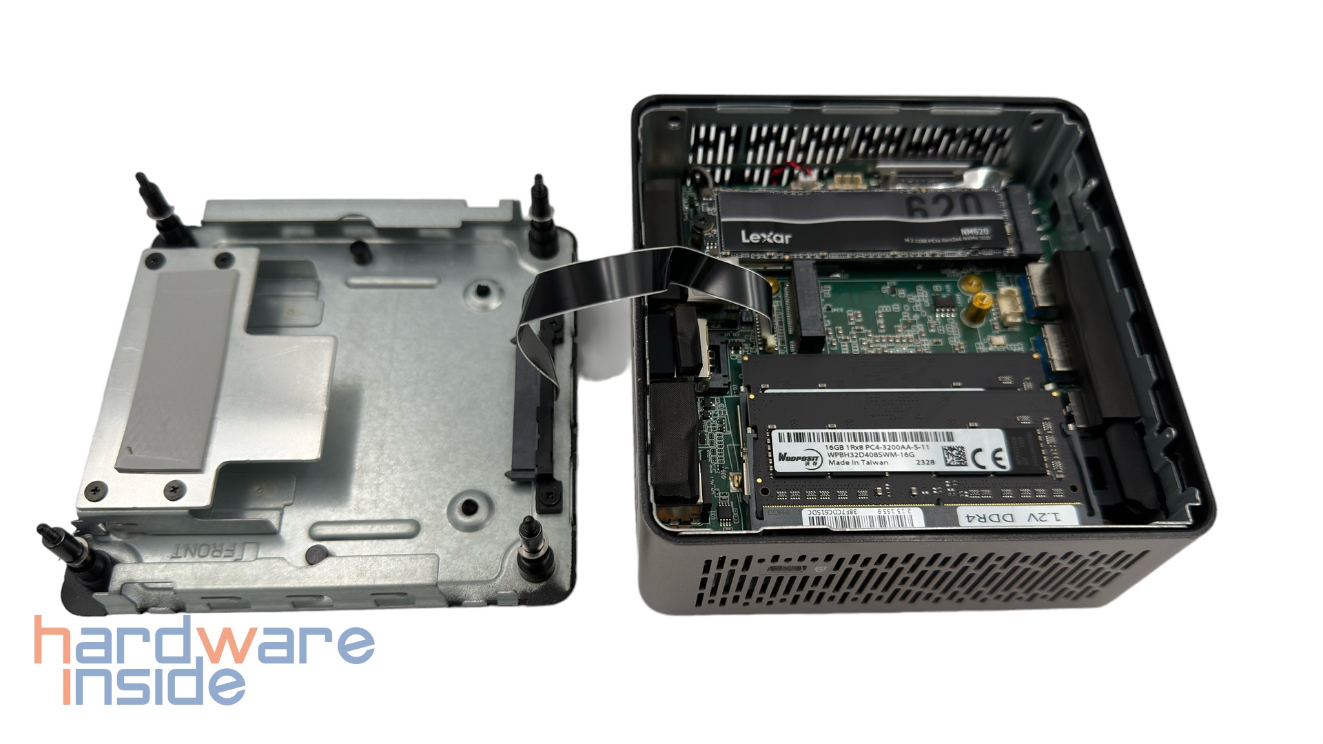 Durch das Lösen der vier bereits erwähnten Schrauben können wir das Oberteil einfach vom Unterteil trennen. Dabei verbleiben die meisten Komponenten im Oberteil. Hier sehen wir die beiden SODIMM Module. Jedes Modul fasst 16 GB und taktet mit bis zu 3.200 MHz, hier kommt DDR4 SODIMM zum Einsatz, wie man ihn auch aus Notebooks kennt. Direkt daneben ist eine M.2 NVME SSD von Lexar mit einem Fassungsvermögen von 512 GB verbaut. Zwischen Arbeitsspeicher und der SSD befindet sich ein Anschluss für eine M.2 SATA SSD. Der Prozessor befindet sich noch weiter oben in der Gehäuseoberseite und sitzt unter einem Kühlblock mit Radiallüfter, wie man ihn aus dem Notebook-Bereich kennt. Der Prozessor ist fest mit dem Mainboard verlötet und lässt sich nicht austauschen.