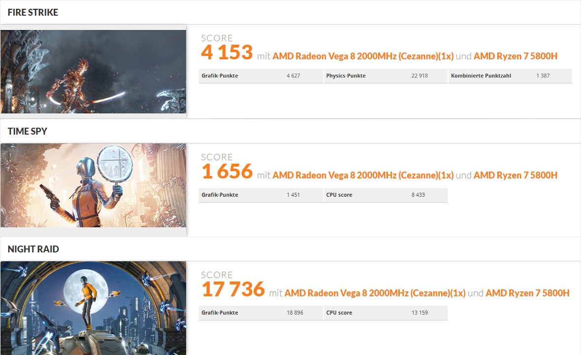 Mit den Benchmarks aus 3DMARK wollen wir herausfinden wie gut sich der GEEKOM A5 Mini PC fürs Gaming eignet. Den Anfang machen wir mit dem Fire Strike Benchmark – hier kommen wir auf 4.627 Grafik- und 22.9178 Physics-Punkte. Die Gesamtpunktzahl liegt bei 4.153, was in Anbetracht der verbauten Hardware zu erwarten ist. Ähnlich ernüchternd ist auch das Ergebnis im Time Spy Benchmark, hier erreichen wir eine Gesamtpunktzahl von 1.656 Punkten, was in etwa einem Office-Notebook entspricht. Mit dem Night Raid Benchmark lassen wir aber auch noch einmal einen Benchmark laufen, welcher genau für solche Systeme mit integrierter Grafik gedacht ist. Hier erreichen wir insgesamt 17.736 Punkte, daher liegen wir geringfügig über der Leistung eines Office-Notebooks. Die detaillierten Ergebnisse der Benchmarks findet ihr über die im Text eingefügten Links.