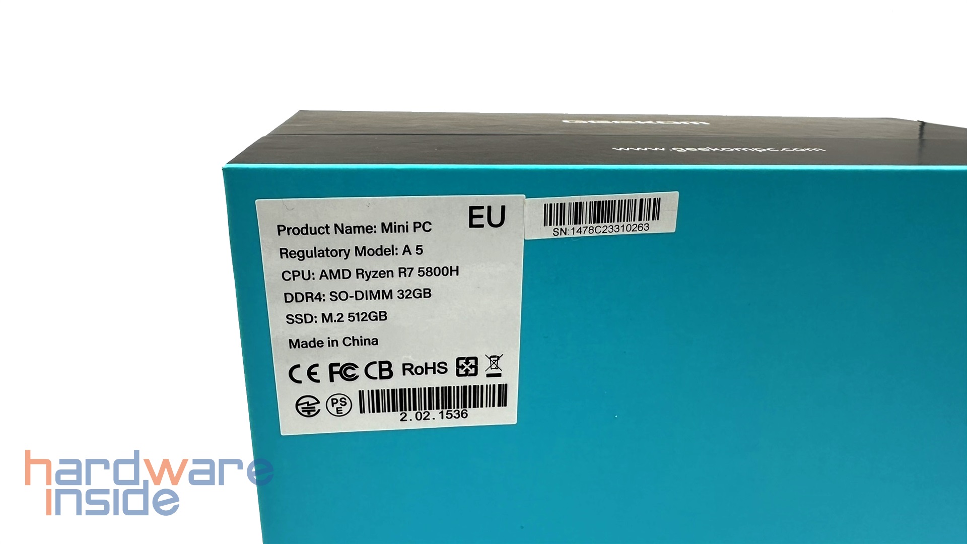 Auf der Rückseite sind keine Informationen aufgedruckt. Stattdessen finden wir in einer Ecke einen kleinen Aufkleber, welcher über einige der verbauten Bauteile informiert. In diesem Fall sind dies ein AMD Ryzen 7 5800H Prozessor, 32 GB DDR4 SO-DIMM Arbeitsspeicher sowie eine 512 GB große SSD. Dazu gibt es noch die Logos der wichtigsten Zertifikate und Barcodes.