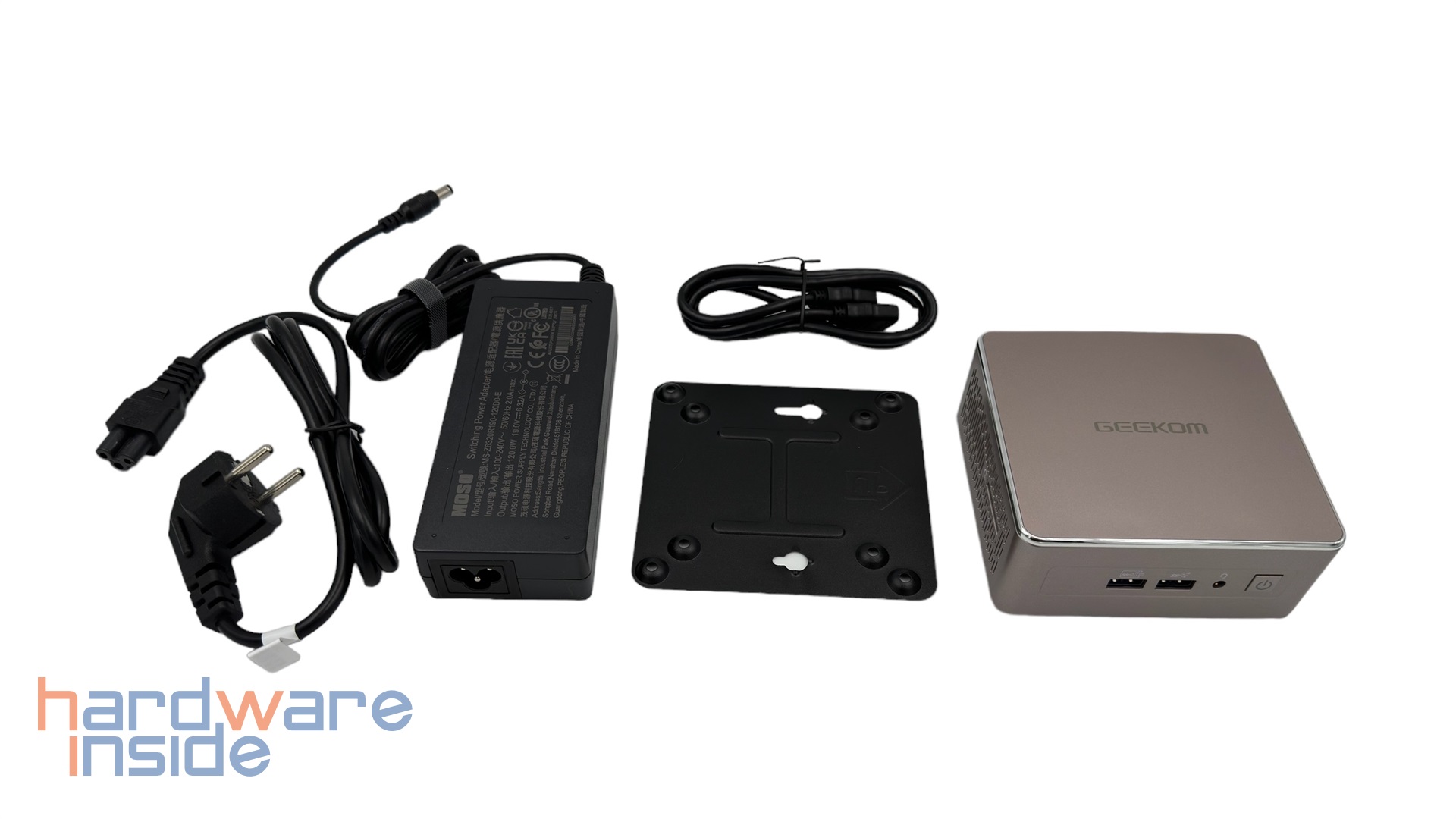 Neben dem GEEKOM A5 Mini PC finden wir noch ein passendes Netzteil nebst Anschlusskabel, sowie ein HDMI-Kabel, eine Montageplatte, die den VESA Standard unterstützt samt passenden Schrauben und schließlich noch eine Schnellstartanleitung.