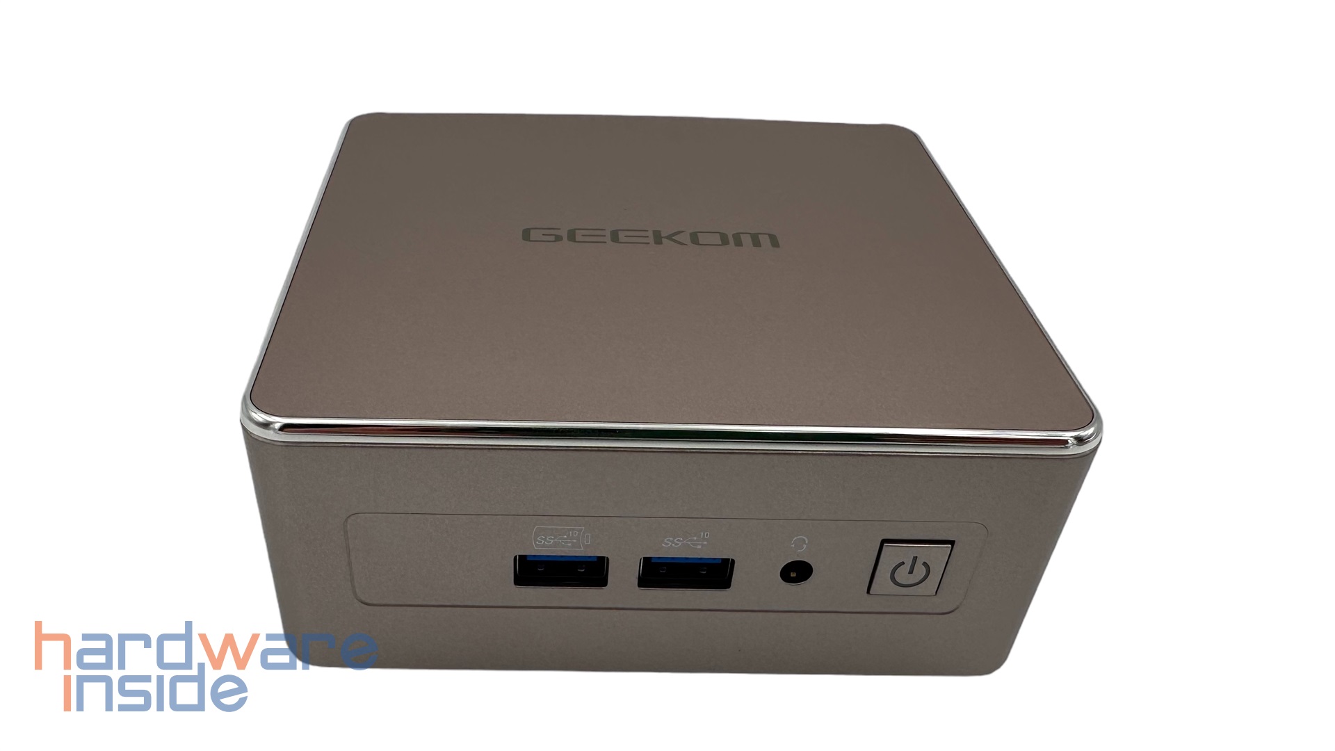 Der GEEKOM A5 Mini PC besteht äußerlich zum größten Teil aus Aluminium, welches in einem hellen Goldton eloxiert ist. Der obere Rand ist poliert, was dem Ganzen eine wertige Anmutung verleiht. Die Oberseite trägt das GEEKOM-Logo wohingegen wir auf der Vorderseite die ersten beiden USB-Anschlüsse sowie den 3,5 mm Klinken-Anschluss und den Ein-/Aus-Taster vorfinden. Der Taster hat eine gute Größe und lässt sich angenehm mit einem haptischen Feedback bedienen.