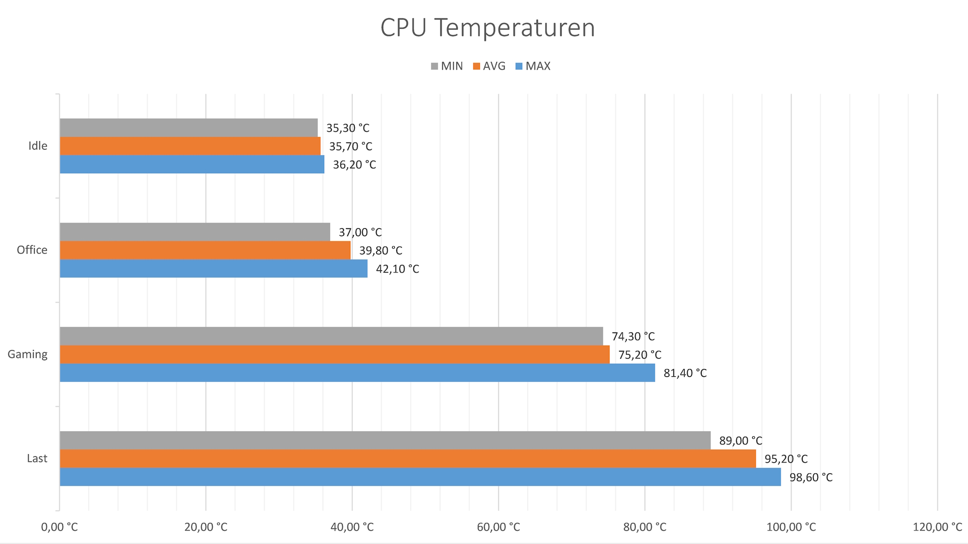 Ein sicherlich wichtiges Thema sind die Temperaturen und den damit verbundenen Geräuschen durch das Kühlungssystem. Im GEEKOM A5 Mini PC kommt eine Kühlung zum Einsatz, wie wir sie auch aus vielen Notebooks kennen. Ein kleiner Radiallüfter drückt dabei Luft durch einen Kühlblock aus Aluminium. In der Praxis funktioniert das im Ruhezustand und Office-Betrieb gut, denn der Rechner bleibt mit maximal 42,10 °C recht kühl und der Lüfter hat nicht viel zu tun. Wenn aber aufwendigere Aufgaben wie Video- & Bildbearbeitung oder Spiele angesagt sind, dann steigt die Temperatur auch gerne mal auf über 80 °C. Dabei versucht der Lüfter sein Bestes die Wärme aus dem Gehäuse zu transportieren. Hierbei ist der Lüfter auch in einem Abstand von 60 cm auf dem Tisch noch gut hörbar. Im Worst Case lasten wir das System mit StressMyPC aus und messen dabei eine Temperatur von 98,60 °C in der Spitze. Wer sich für dieses System entscheidet, der sollte darauf verzichten, diesen hinter dem Monitor zu verbauen oder zuzustellen. Zumindest insofern mehr als nur einfach Office-Arbeiten anfallen.