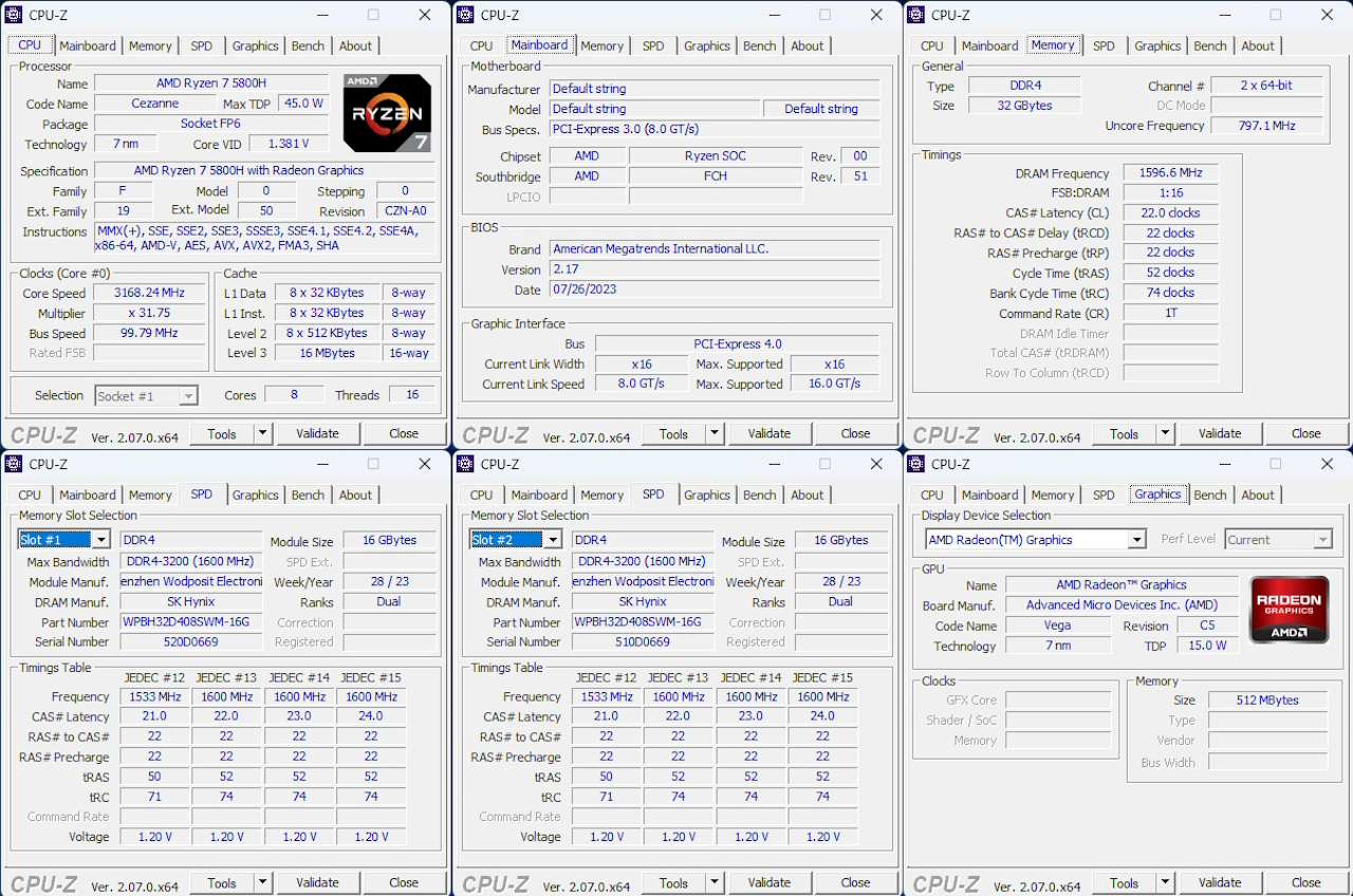 Werfen wir zunächst einen Blick auf die Hardware-Komponenten. Ein AMD Ryzen 7 5800H mit acht Kernen (16 Threads) und integrierter AMD Radeon Vega 8 Grafik ist hier eingebaut. Der Prozessor ist auch in einigen Notebooks zu finden. Der Prozessor hat einen Grundtakt von 3,2 GHz und eine maximale Leistungstaktrate von bis zu 4,4 GHz. Typisch genehmigt sich dieser Prozessor bis zu 35 Watt, dabei kann er bis zu 105 °C heiß werden. Beim Speicher wird DDR4 SODIMM Speicher bis 32 GB je Riegel unterstützt, der maximale Speichertakt liegt dabei bei bis zu 3.200 MHz. GEEKOM hat hier zwei SODIMM Speicherbausteine von Hynix zu je 16 GB mit einer Taktfrequenz von 3.200 MHz verbaut. Wer nachrüsten möchte, kann die Gesamtkapazität auf bis zu 64 GB steigern. Bei der PCIe Schnittstelle setzt diese Plattform noch auf PCIe 3.0.
