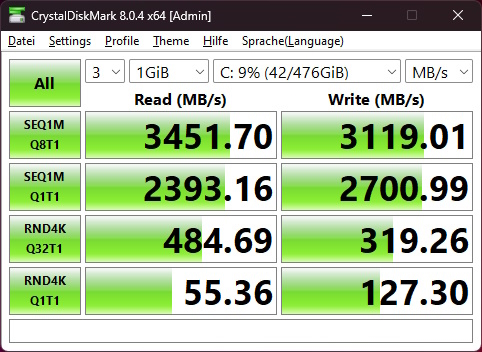 Weiter machen wir mit der Benchmarking-Software CrystalDiskMark, welche die Geschwindigkeit von Festplatten und SSDs misst. Bei der SSD setzt GEEKOM auf eine Lexar NM620 mit einer Kapazität von 512 GB. Der Benchmark zeigt uns, dass die Herstellerangaben nicht nur eingehalten werden, sondern dass sie sogar geringfügig übertroffen werden. Die Herstellerangabe zum Lesen mit bis zu 3.500 MB/s wird nur mit 3.451,70 MB/s knapp verpasst. Dafür sieht das beim Schreiben anders aus, statt der 2.400 MB/s laut Hersteller messen wir hier 3.119,01 MB/s. Die Geschwindigkeit sollte daher für die meisten Anwendungen mehr als ausreichend sein.