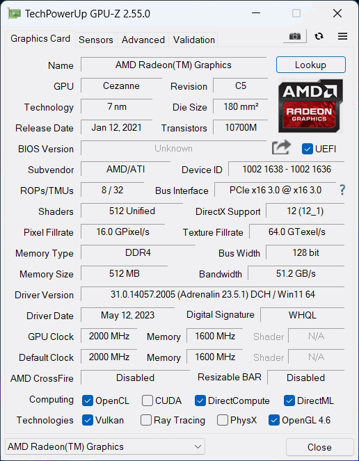 Wie bereits erwähnt kommt hier eine AMD Radeon Vega 8 Grafik zum Einsatz. Diese bezieht ihren Speicher vom Arbeitsspeicher, wodurch die Geschwindigkeit auf die 3.200 MHz des Speichers begrenzt ist. Der Grundtakt des Grafikprozessors liegt bei 2.000 MHz. Angebunden ist die Grafik über PCIe x16 3.0.