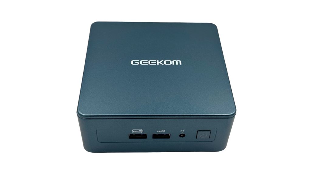 Der GEEKOM Mini IT13 ist in seinen Abmessungen sehr kompakt. Das Gehäuse besteht aus blau gefärbtem Kunststoff. Die Oberseite trägt das GEEKOM-Logo wohingegen wir auf der Vorderseite die ersten beiden USB-Anschlüsse sowie den 3,5 mm Klinken-Anschluss und den Ein-/Aus-Taster vorfinden. Der Taster hat eine gute Größe und lässt sich angenehm mit einem haptischen Feedback bedienen.