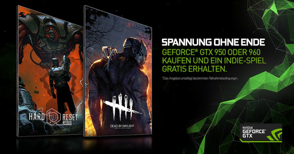 Es richtet sich primär an alle Gamer, die eine preiswerte Grafikkarte suchen: Nur für kurze Zeit erhalten Spieler beim Kauf einer GeForce GTX 950 oder GTX 960 Grafikkarte oder eines Notebooks mit GeForce GTX 950M oder GTX 960M entweder den Multiplayer-Horror-Hit Dead By Daylight oder den Indie-Shooter Hard Reset Redux, der mit adrenalingeladener Action aufwartet.