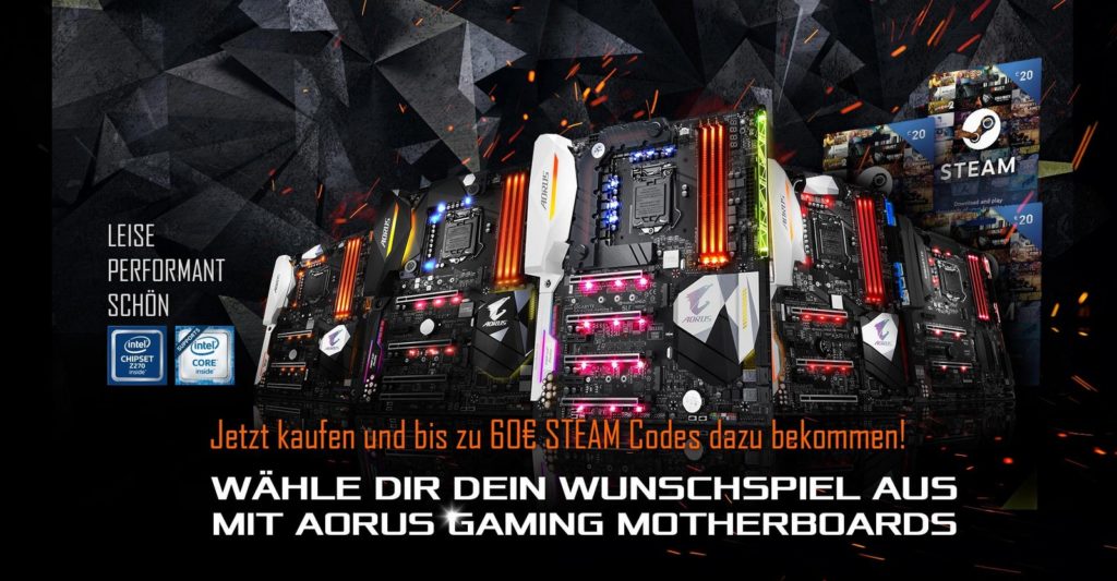 Taipeh, Taiwan, April 2017 – GIGABYTE TECHNOLOGY Co. Ltd, freut sich, zwei Werbeaktionen anzukündigen, eine für Intel Mainboards und eine weitere für AMD-Mainboards. Bei diesen Aktionen, die am 11. April 2017 starten und am 30. Juni 2017 enden, erhalten Nutzer bis zu 60 € in Form von Steam-Guthaben-Codes beim Kauf von ausgewählten GIGABYTE/AORUS Gaming-Mainboards! Steam-Guthaben-Codes funktionieren genau wie Geschenkkarten, die in Ihrem persönlichen Steam-Konto gegen ein Steam-Guthaben eingelöst und zum Kauf von Spielen, In-Game-Inhalten, Software und allen anderen im Steam-Store zu kaufenden Artikeln verwendet werden können.