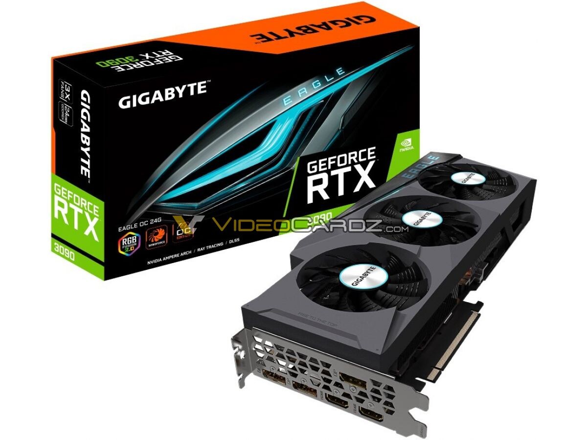 Hier sind die ersten Bilder der GeForce RTX 3090 „Ampere“ Eagle OC und Gaming OC Custom-Design-Grafikkarten von GIGABYTE. Beide Karten implementieren die neueste Generation der WindForce 3X-Kühlungslösung des Unternehmens, die über einen Triple-Slot, ein Lüftertrio und verschiedene Grade von werksseitig übertakteten Geschwindigkeiten verfügt. Die Eagle OC SKU konnte etwas oberhalb der Gaming OC SKU positioniert werden. Über den beiden könnte GIGABYTE seine begehrte Grafikkarte der Marke AORUS Gaming positionieren. Aus den gestrigen Gainward-Lecks wurde festgestellt, dass 24 GB die Standard-Speichergröße für den RTX 3090 ist, während 10 GB für den RTX 3080 Standard sind.