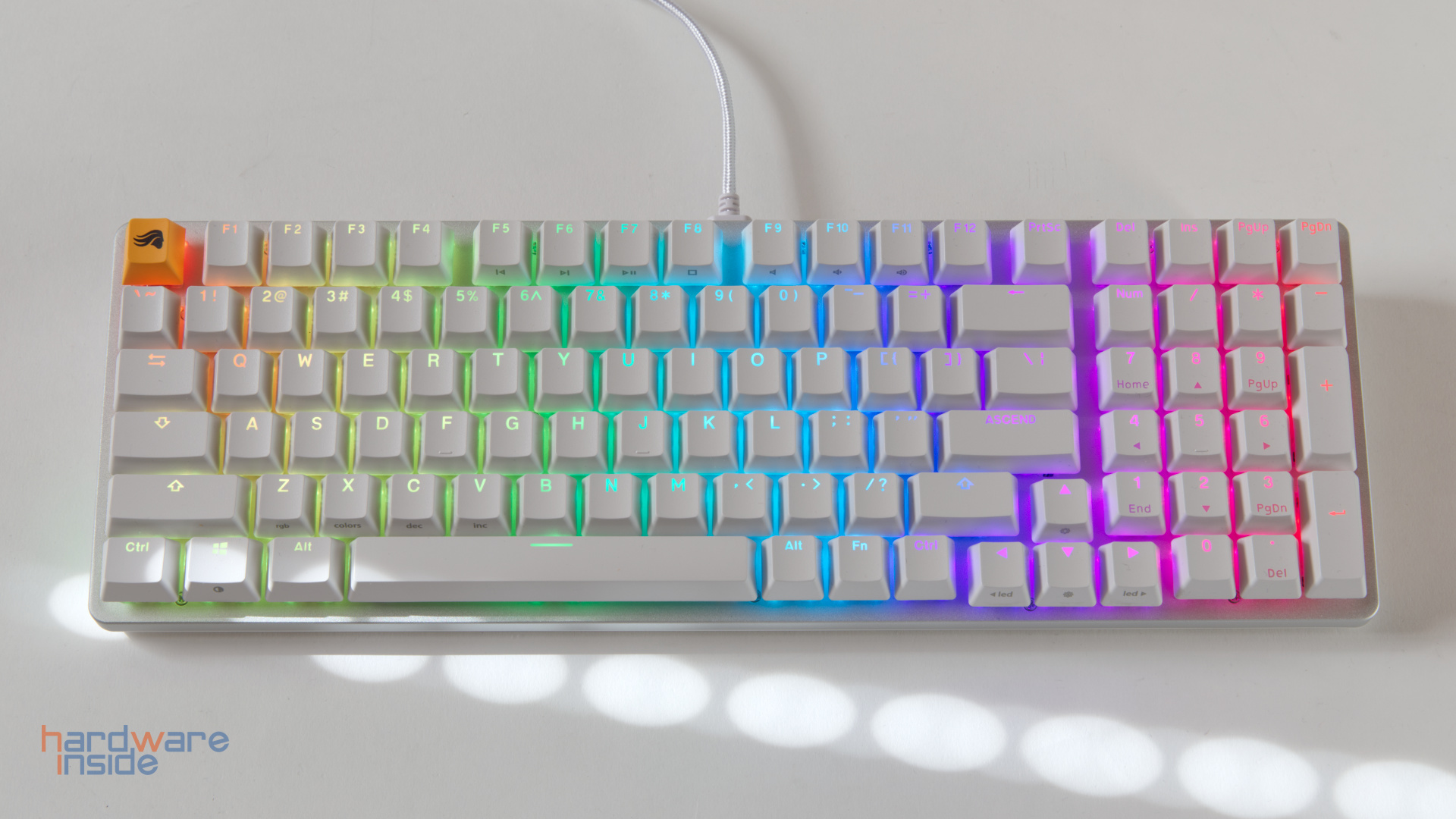 Direkt bei Glorious gibt es drei Farbvarianten und zwei Größen zu kaufen, dabei stehen Weiß, Schwarz und Pink zur Auswahl. Wir haben uns für die weiße Version entschieden, Gehäuse und Keycaps haben dabei immer dieselbe Farbe. Der Ersteindruck nach dem Auspacken könnte dabei nicht besser sein, denn die Tastatur wiegt mit 1,25 kg unglaublich viel für die verhältnismäßig geringe Größe (96 %). Auch die verfügbare Compact-Variante (65 %) wiegt fast 0,9 kg, beachtlich viel für eine Tastatur dieser Preisklasse. In jedem Fall wird auch dadurch ein Verrutschen des Keyboards effektiv verhindert. Die Abmaße von 375 x 37,5 x 125 mm werden vor allem durch fehlende Media-Tasten erkauft, diese Funktionen werden dann über Zweitbelegungen genutzt – welche wiederum vorne an den Keycaps abgedruckt wurden.