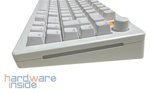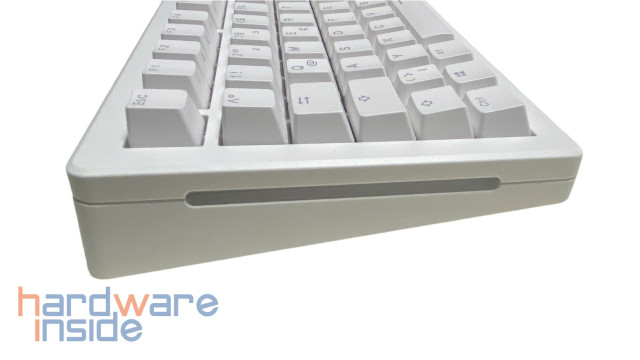 Auch der untere Teil des optisch massiven Gehäuses besteht aus weißem ABS-Kunststoff. Ein Blick auf die Seite zeigt, dass das Tastatur-Gehäuse deutlich wuchtiger und auch keilförmiger designt wurde. Dadurch ist der Anstellwinkel deutlich steiler. Optisch aufgewertet werden die Seiten durch einen Streifen, der im Betrieb von RGB-LEDs beleuchtet wird.