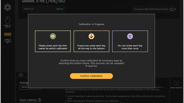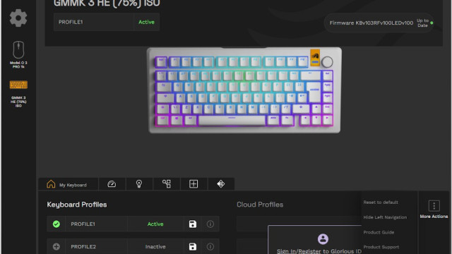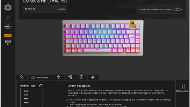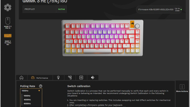 Wird die Tastatur auf der linken Seite ausgewählt, gelangt man in das Menü mit den Einstellungen für die GMMK 3 HE 75 %, oben werden das aktive Profil sowie die installierte Firmware angezeigt. Hier gibt es fünf Reiter, der erste „My Keyboard“ zeigt die drei möglichen Plätze für selbst erstellte Profile. Auf der rechten Seite befinden sich weitere wählbare Optionen, wie z. B. ein Factory-Reset. Der zweite Reiter „Performance“ bietet die Möglichkeit, die Polling-Rate einzustellen und die Switches zu kalibrieren.