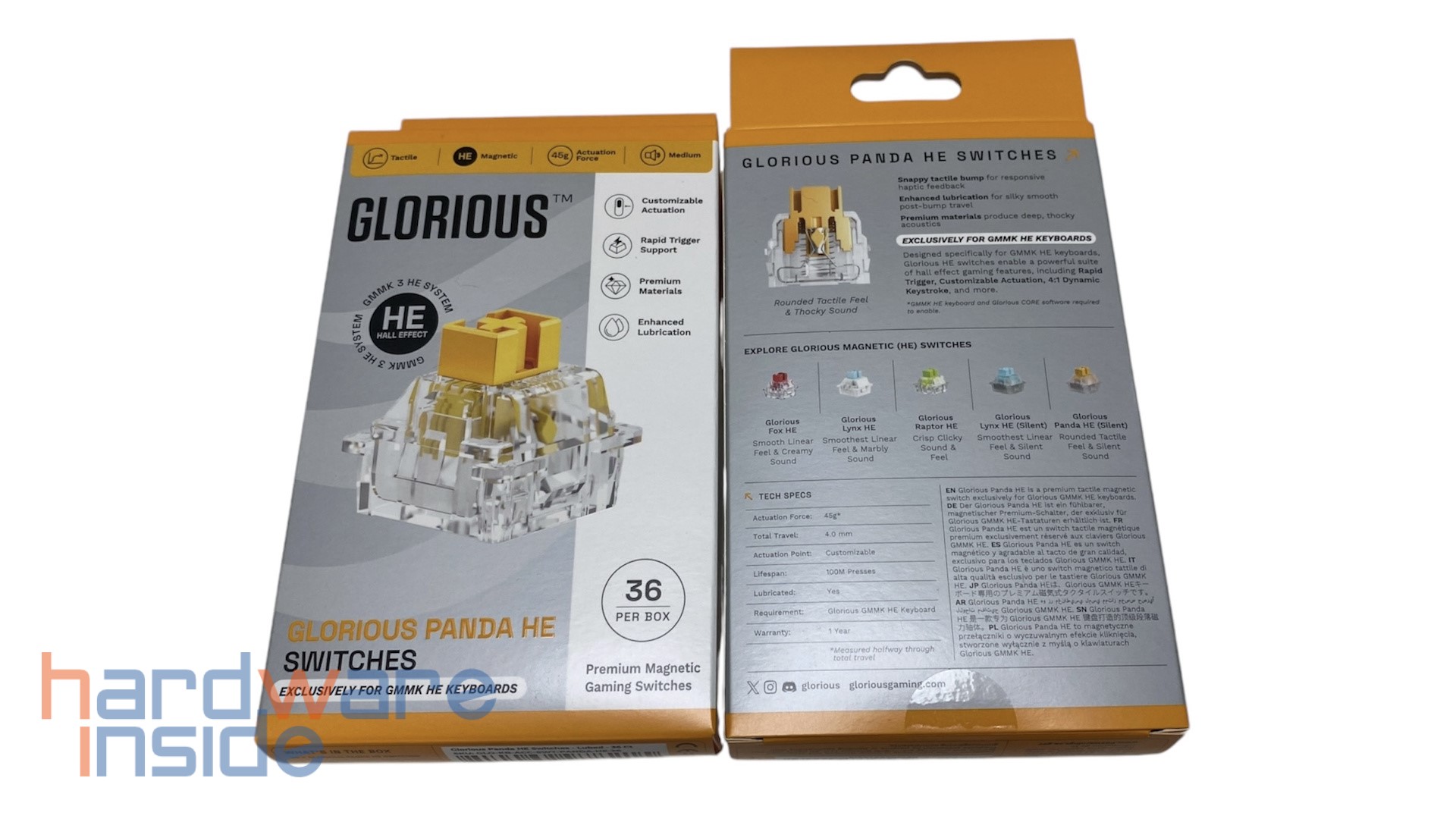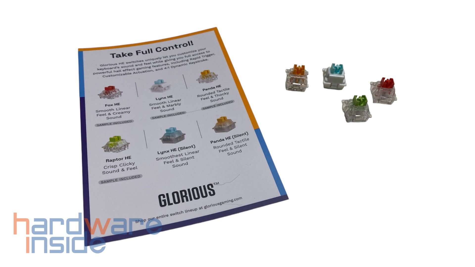 Um einen kleinen Einblick auf das HE-Switch-Sortiment zu erhalten, legt Glorious vier verschiedene Switch-Typen (FOX HE, LYNX HE, RAPTOR HE und PANDA HE) im Lieferumgang bei. Alle Switches haben eine MX-Stern-Aufnahme und sind geschmiert, um eine weiche und präzise Bedienung zu gewährleisten.