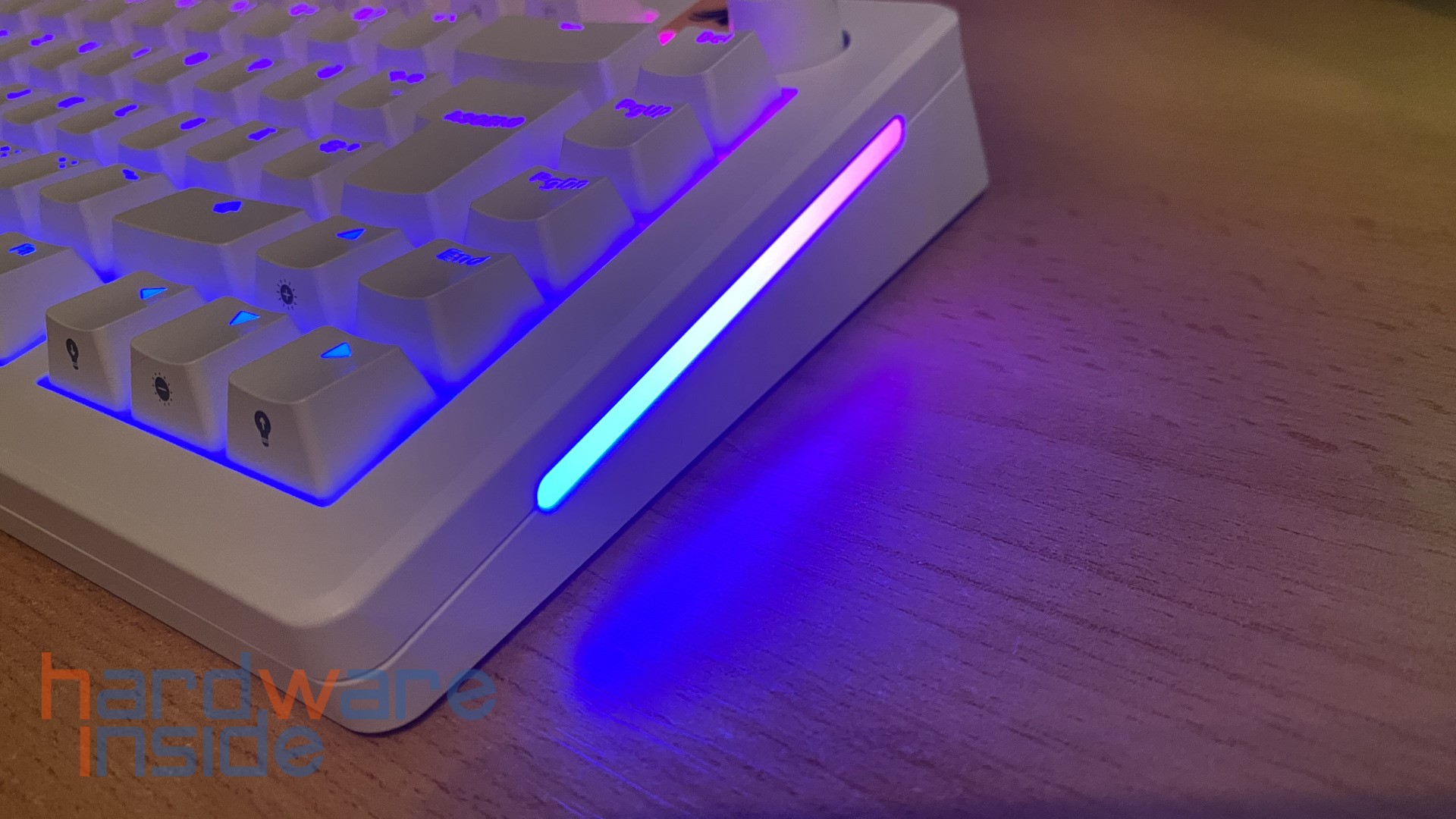 Auch der untere Teil des optisch massiven Gehäuses besteht aus weißem ABS-Kunststoff. Ein Blick auf die Seite zeigt, dass das Tastatur-Gehäuse deutlich wuchtiger und auch keilförmiger designt wurde. Dadurch ist der Anstellwinkel deutlich steiler. Optisch aufgewertet werden die Seiten durch einen Streifen, der im Betrieb von RGB-LEDs beleuchtet wird.