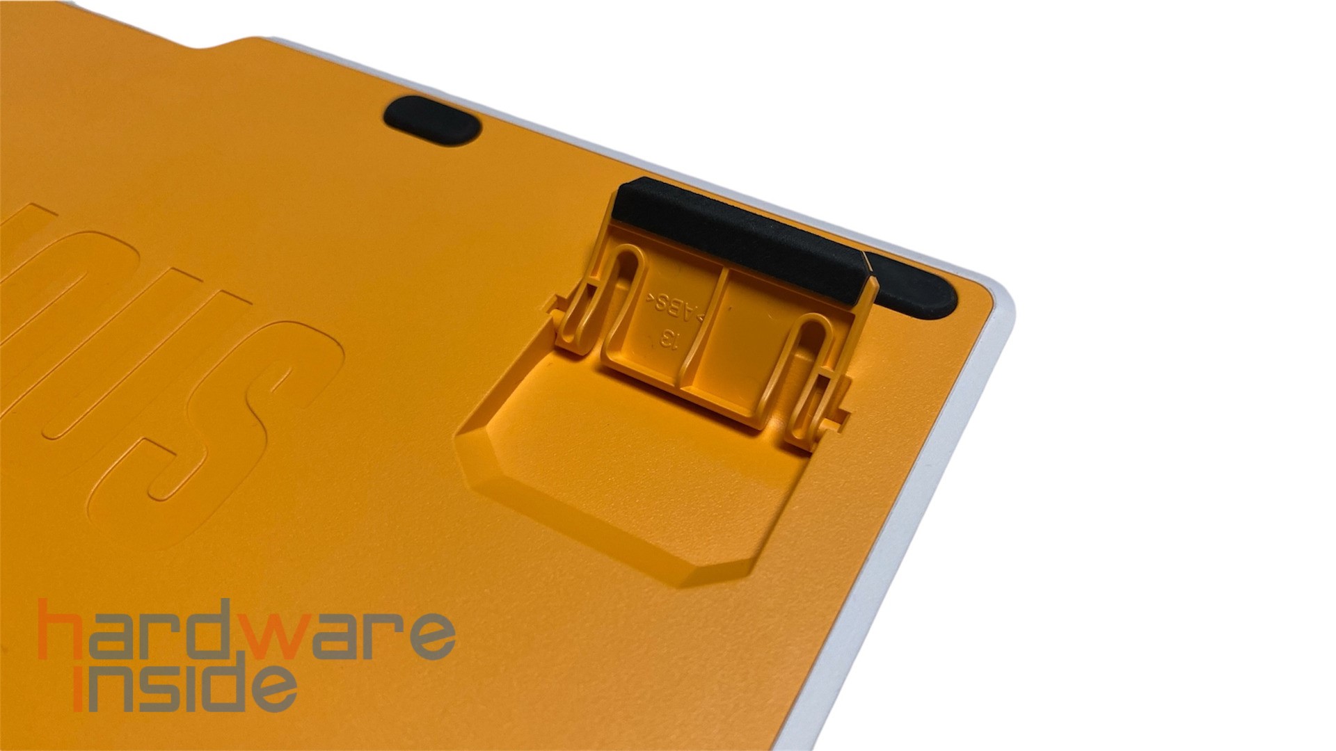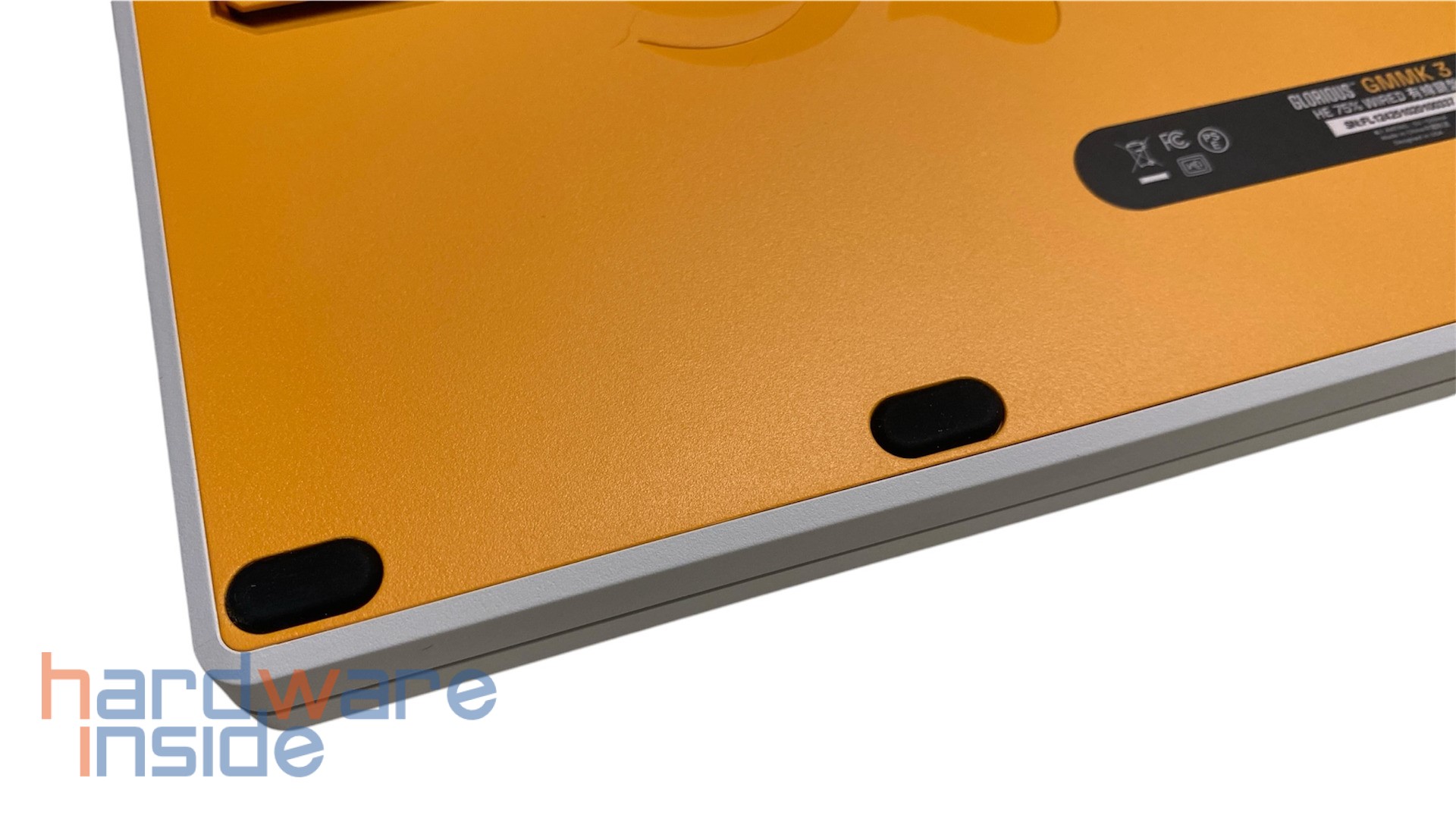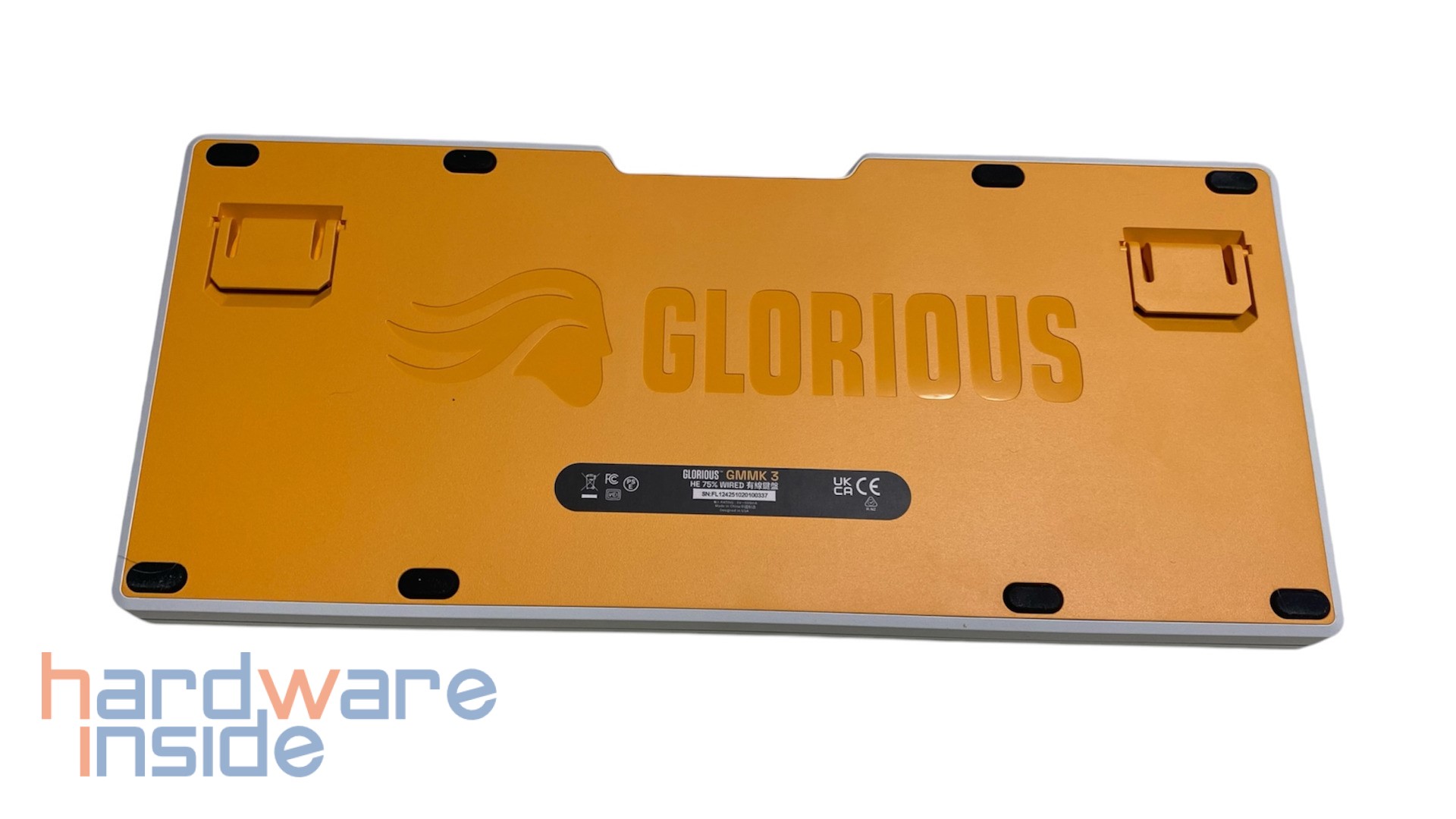 Wir drehen die GMMK 3 HE um, hier begrüßt uns eine Grundplatte in einem intensiven Orange. In der Mitte ist ein großes Hersteller-Logo mit Schriftzug eingeprägt. Um ein Verrutschen der GMMK 3 HE zu verhindern, sind acht Gummifüße an der Unterseite untergebracht. Zwei breite ausklappbare Standfüße sind in die Grundplatte eingelassen. Diese sind ebenfalls an der Auflagefläche gummiert, damit die GMMK3 HE 75 % einen sicheren Stand behält.