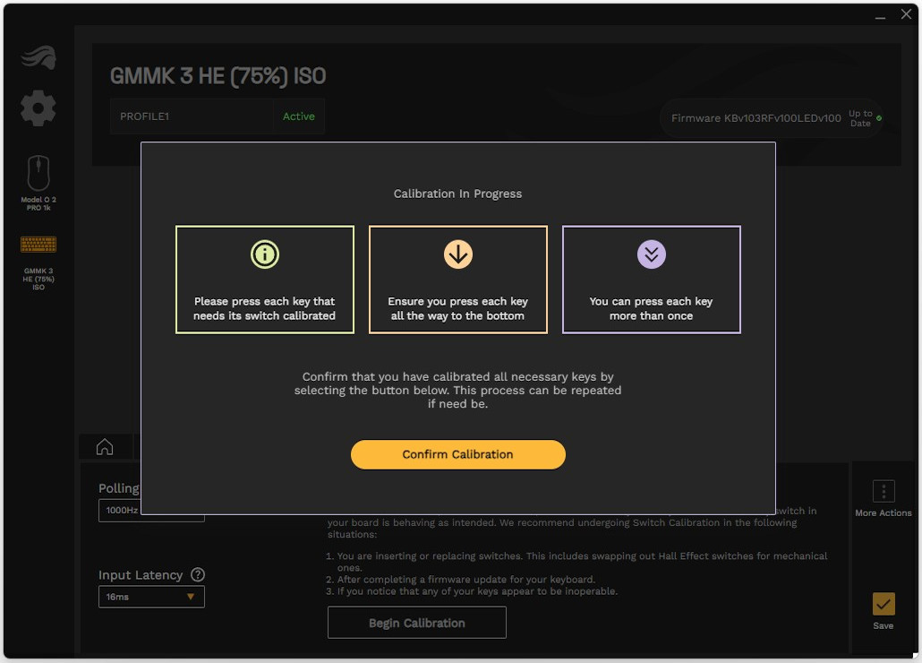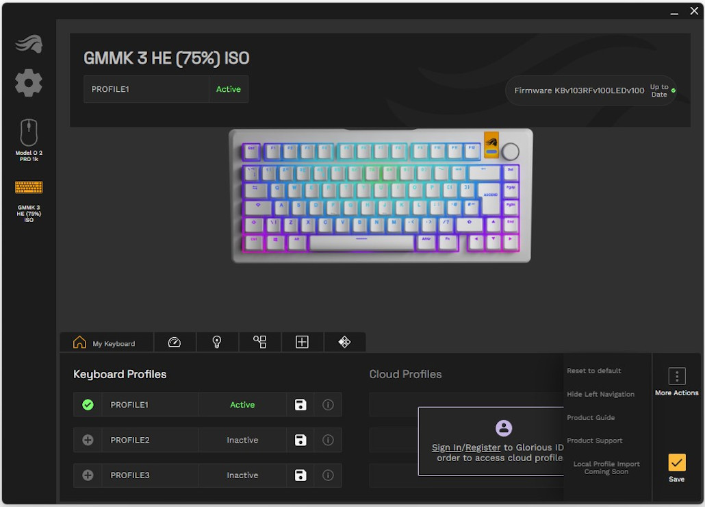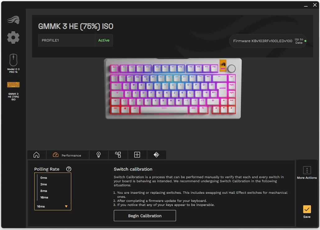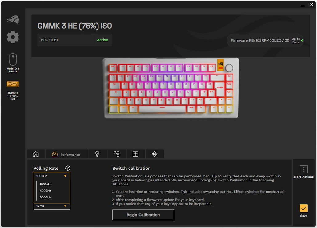 Wird die Tastatur auf der linken Seite ausgewählt, gelangt man in das Menü mit den Einstellungen für die GMMK 3 HE 75 %, oben werden das aktive Profil sowie die installierte Firmware angezeigt. Hier gibt es fünf Reiter, der erste „My Keyboard“ zeigt die drei möglichen Plätze für selbst erstellte Profile. Auf der rechten Seite befinden sich weitere wählbare Optionen, wie z. B. ein Factory-Reset. Der zweite Reiter „Performance“ bietet die Möglichkeit, die Polling-Rate einzustellen und die Switches zu kalibrieren.