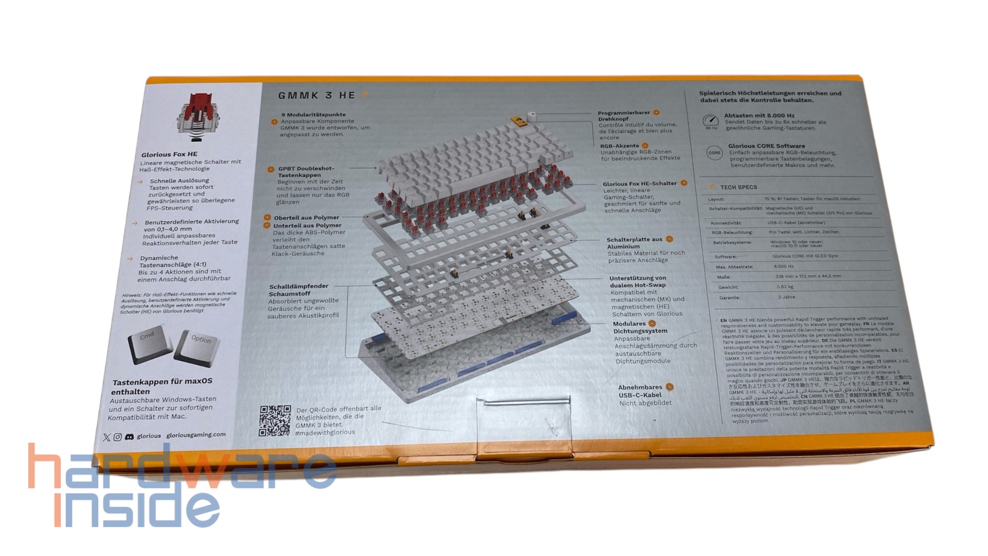 Bei der Kartonage dominieren die Farben Orange und Silber. Auf der Vorderseite ist eine große Produktabbildung, der Herstellername, die Produktbezeichnung, die Kompatibilität sowie der Satz “Die anpassungsfähigsten Tastaturen der Welt“ aufgedruckt. Die rechte Seite gibt Infos über die verbauten Switches und weitere Features. Die Rückseite informiert sehr detailliert mit einem Bild über die speziellen Produktfeatures. Auch die technischen Daten sind in einer kurzen Tabelle auf der rechten Seite zu sehen. Ein QR-Code leitet direkt auf die Seite des Herstellers, die alle Anpassungsmöglichkeiten bereithält. Weitere Informationen zur Größe, Bezeichnung, Farbe und dem ISO-Layout sind zusammen mit dem Herstellerlogo auf der Längsseite abgebildet.