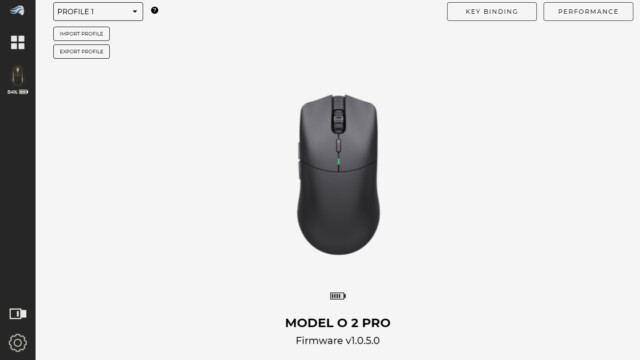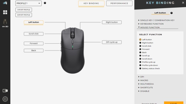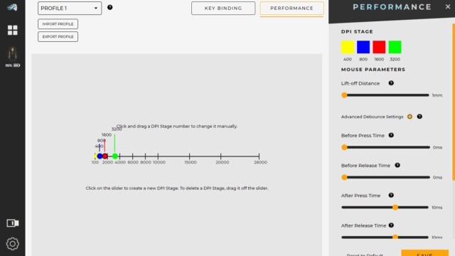 Um die Einstellungen an der GLORIOUS MODEL O2 PRO vorzunehmen, wird die Software von GLORIOUS namens „CORE“ benötigt. So können wir individuelle Profile erstellen und importieren/exportieren. Im ersten Abschnitt können wir den Tasten individuelle oder vorgegebene Funktionen zuweisen, Makros erstellen oder Tasten deaktivieren. Auch der obere Schalter zur DPI-Einstellung lässt sich anpassen. Im Abschnitt „Leistung“ können wir die Lift-Off-Distance beeinflussen, die Auslöseverzögerung verbessern (Debounce Time) und die Polling Rate erhöhen.