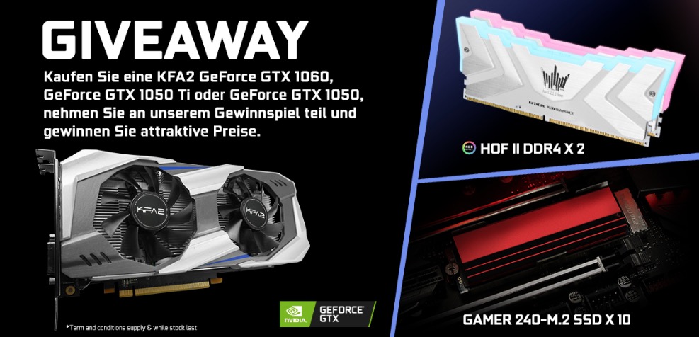 Bremen / 3. April 2019: Grafikkarten-Spezialist KFA2 startet ab sofort sein neues Frühlings-Gewinnspiel 2019, bei dem es attraktive Preise zu gewinnen gibt. Bis zum 30. April 2019 können Käufer einer KFA2 GeForce GTX1050, einer KFA2 GeForce GTX1050Ti oder einer KFA2 GeForce GTX1060 an dem neuen KFA2-Gewinnspiel 2019 teilnehmen und eine schnelle KFA2 M.2 240 SSD oder einen hochwertigen HOF II 3600 Mhz Arbeitsspeicher gewinnen. Die Teilnehmer müssen lediglich innerhalb des Aktionszeitraums ihren Originalbeleg des KFA2-Produkts (GeForce GTX1050, GTX1050Ti oder GTX1060) hochladen und sind damit automatisch für die Teilnahme an der Verlosung qualifiziert.