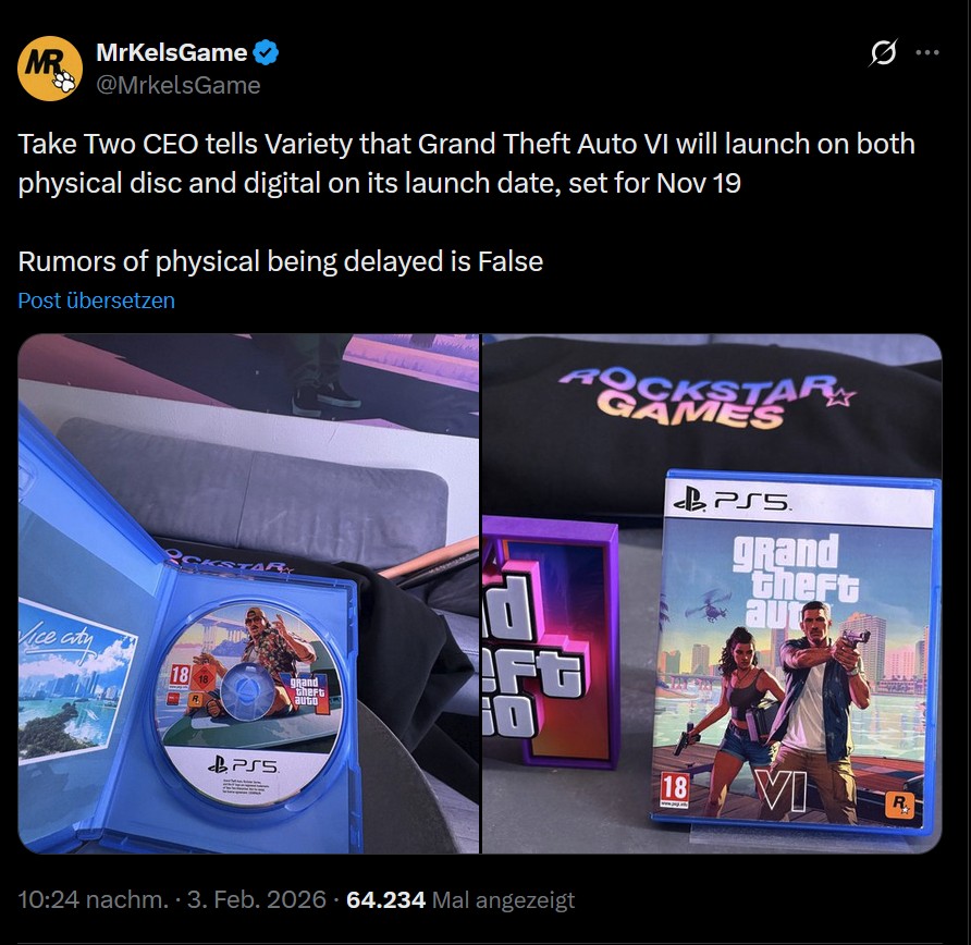 Nach mehreren Verschiebungen bestätigt Take-Two erneut: Grand Theft Auto 6 soll am 19. November 2026 erscheinen. Zudem startet die Marketingkampagne im Sommer, inklusive neuer Trailer und Infos zu GTA Online.