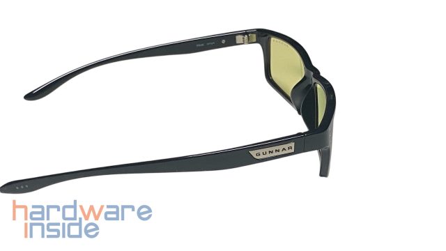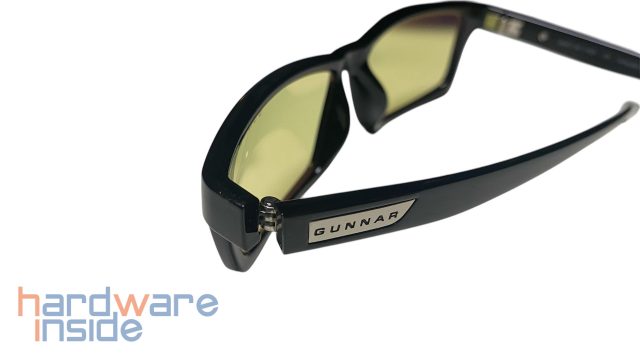 Die gleiche schlichte Optik besitzen auch die beiden Ohrenbügel. Diese sind auch aus dem gleichen Kunststoff gefertigt. Gehalten werden sie durch silberne Mehrgelenkscharniere, die mit dem Gestell verbunden sind. An den Seiten ist das GUNNAR-Logo in Form einer silbernen Platte außen auf den Bügel eingesetzt.