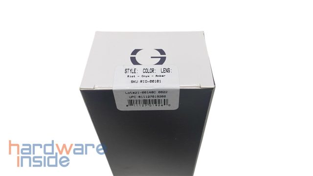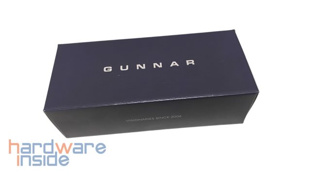 Die GUNNAR Riot wird in einem schlichten rechteckigen grauen Karton mit weißen Akzenten an den Seiten geliefert. Auf der Oberseite ist in großen weißen Lettern der GUNNAR-Schriftzug aufgedruckt. An der unteren Längsseite ist VISIONARIES SINCE 2006 ebenfalls in Weiß zu sehen. Das GUNNAR-Logo befindet sich auf den Seiten. Ein zusätzlicher Aufkleber informiert über das Modell, die Farbe und die verbauten Gläser.