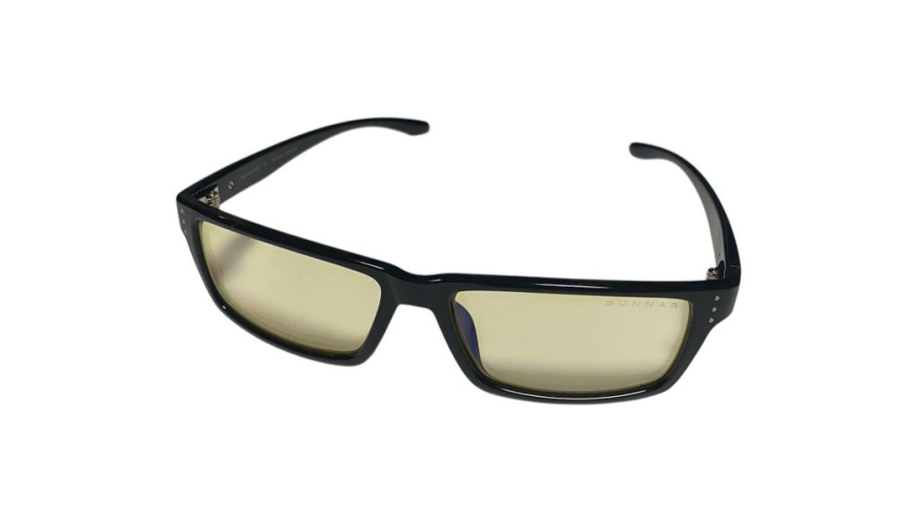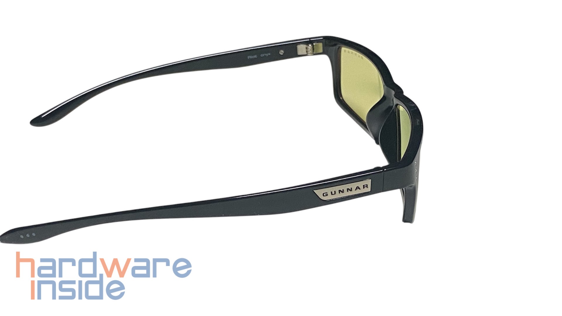 Unser Riot-Modell ist mit AMBER-Gläsern ausgestattet. Da wir die Brille ja auch für die Bildschirmarbeit einsetzen wollen, haben wir so die geeignetsten Gläser. Die gelbe Färbung ist gleichmäßig auf beiden Gläsern aufgebracht. Hier werden 60 % des blauen Lichtes im 450-nm-Bereich herausgefiltert. Das Einsatzgebiet sind alle Arten der Bildschirmarbeit, Dateneingabe und Lesen. Auf dem rechten Glas ist oben auch noch der GUNNAR-Schriftzug eingearbeitet.