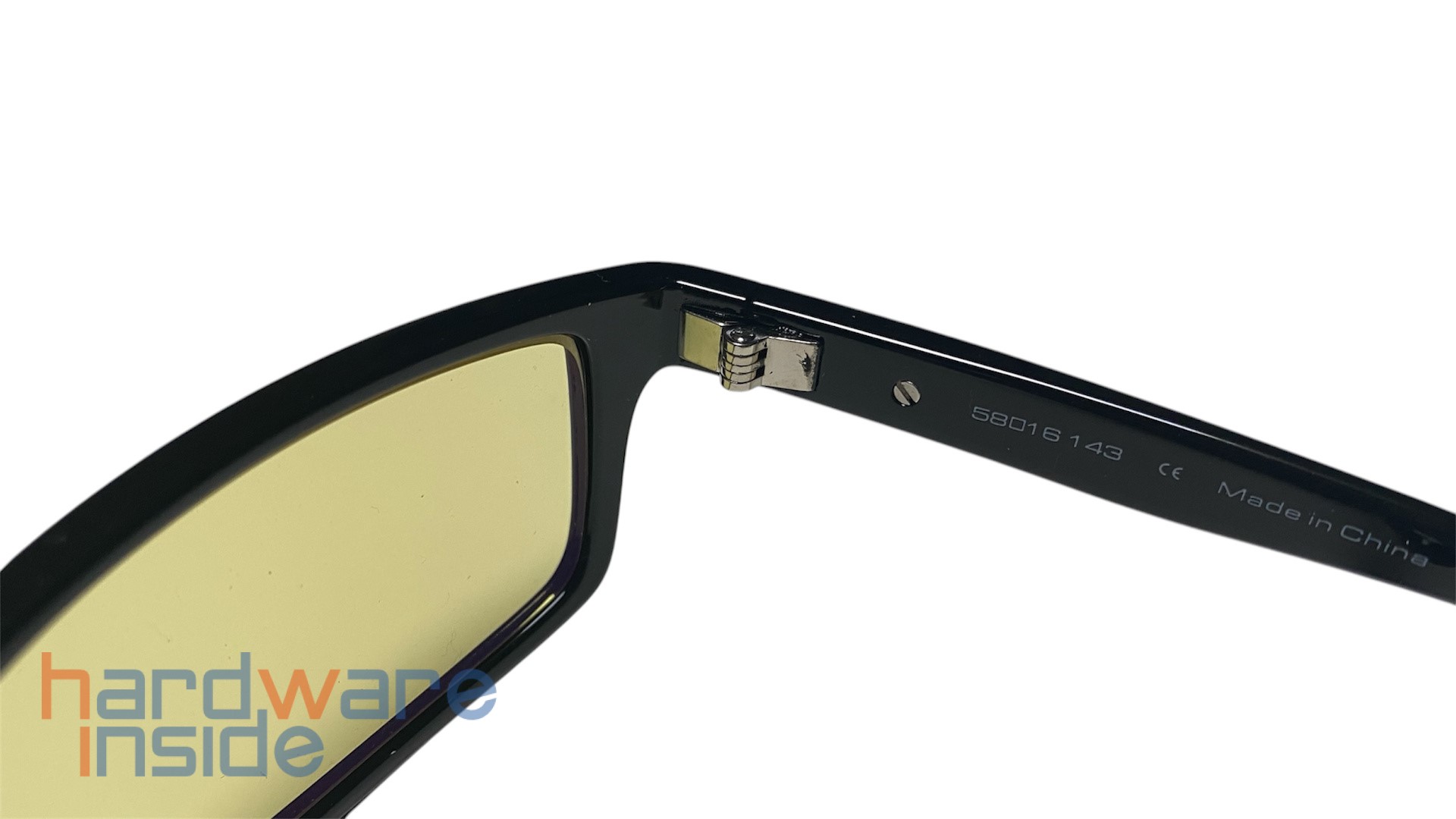 Die gleiche schlichte Optik besitzen auch die beiden Ohrenbügel. Diese sind auch aus dem gleichen Kunststoff gefertigt. Gehalten werden sie durch silberne Mehrgelenkscharniere, die mit dem Gestell verbunden sind. An den Seiten ist das GUNNAR-Logo in Form einer silbernen Platte außen auf den Bügel eingesetzt.