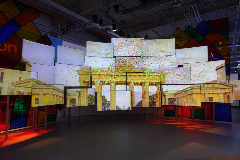 Samsung zeigte zwischen all der Technik auch zahlreiche Fernseher, uns ist vor allem der Q8C aufgefallen. Dieser Fernseher bietet QLED, ist Curved und war sehr Blickwinkel stabil. Dank Lichtleiterkabel wirkt der hintere Teil des Fernsehers sehr aufgeräumt. Das Lichtleiterkabel geht zu einer Verteilerbox, in dieser werden die restlichen Kabel wie HDMI usw angeschlossen.