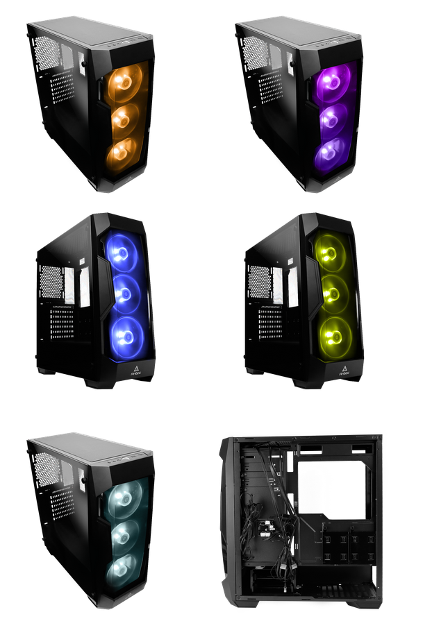 Dem Bau eines leistungsfähigen Systems sind mit dem Antec DF500RGB kaum Grenzen gesetzt. Drei RGB-Lüfter sind bereits im Lieferumfang enthalten, so dass der User das Rig mit einzelnen Farben anpassen oder verschiedene Modi wie Pulsieren, Atmen oder per Mainboardcontroller z.B. via Aura Sync steuern kann. Das abgedunkelte Fenster aus 4 mm gehärtetem Glas lässt die Komponenten in voller Pracht erscheinen, während die transparente Frontplatte von Gun Metal Akzentstreifen flankiert wird. Das stabile Chassis misst 470 mm x 200 mm x 480 mm (T x B x H) und ist kompatibel mit ATX-, Micro-ATX- und Mini-ITX-Motherboards.