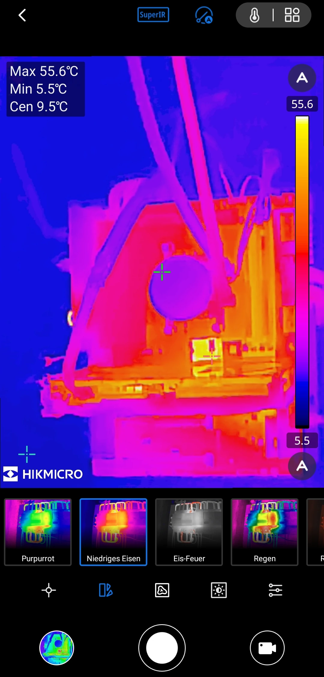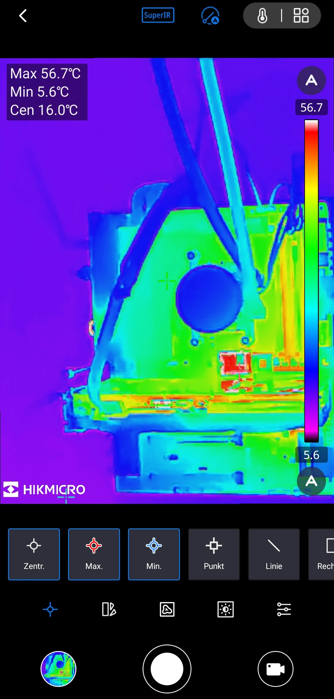 Für die Messung ist die App bestens geeignet, auch für mehrere Messpunkte gleichzeitig. Aufnahmen auf Bild und Video funktionieren (bis auf den genannten Bug) einwandfrei. Während der Messung kalibriert sich die Kamera von Zeit zu Zeit automatisch. Diese Funktion kann deaktiviert und manuell durchgeführt werden. Die Kalibrierung ist für die Ausgabe einer korrekten Temperatur und die Schärfe des Bildes erforderlich.