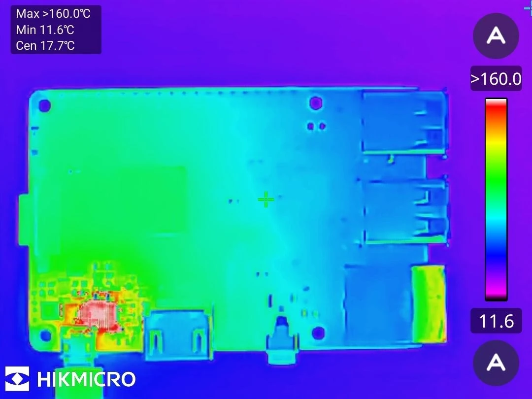 Auf diesem Bild sehen wir einen defekten Raspberry Pi 3B mit Kurzschluss. Das Board ist bereits seit Längerem kaputt. Mithilfe der Wärmebildkamera lässt sich die defekte Komponente in der Nähe der Ladebuchse schnell ausfindig machen.