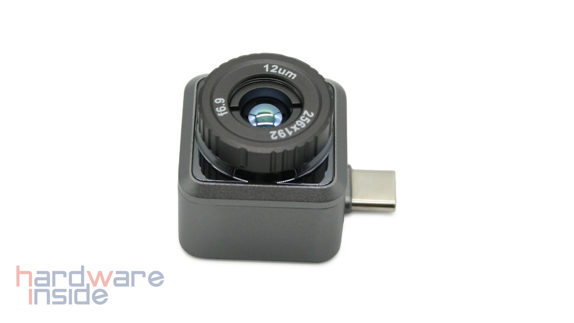 Auf der Front fällt der große Sensor vor allem durch sein Fokusobjektiv schnell ins Auge, dieser bietet bei einem Sichtfeld von 25° × 18.8° eine Auflösung von 256 × 192 Pixel. Es handelt sich dabei um ein schmales Sichtfeld, das für Detailaufnahmen sowie Aufnahmen in größerer Entfernung gut geeignet ist, für großflächige Aufnahmen innen je nach Raumgröße aber schlechter geeignet sein kann. Für diese Anwendungsfälle bietet der Hersteller alternative Modelle mit einem größeren Blickwinkel an. Um in jedem Szenario ein scharfes Bild zu erzeugen, kann am Objektiv eine manuelle Fokussierung vorgenommen werden.