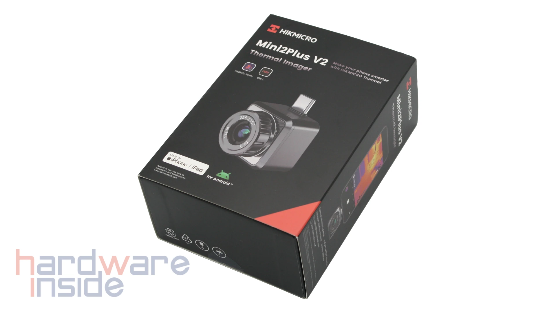 Die HIKMICRO Mini2Plus V2 ist eine äußerst kompakte Wärmebildkamera, die für die Verwendung mit einem Smartphone gedacht ist. Den USB-C Stecker mal außen vor gelassen, ist die Kamera gerade einmal 26,6 x 26,6 x 25 mm groß, das matte Metallgehäuse ist dunkelgrau. Sie lässt sich mit aktuellen Smartphones mit USB-C und mit dem beigefügtem Adapter auch mit älteren iPhones mit Lightning-Anschluss nutzen.
