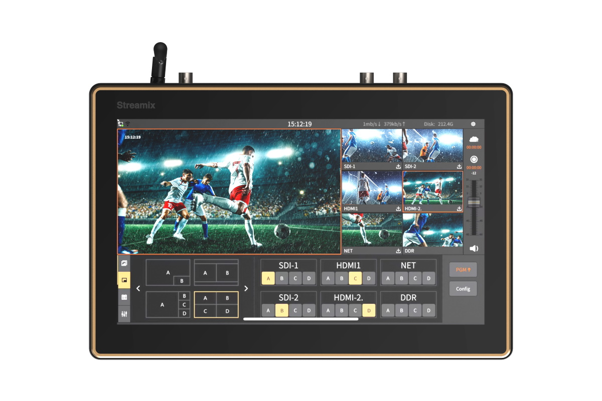 Mit dem Streamix M1 können Sie jeden Winkel Ihrer Veranstaltung aufnehmen durch die Unterstützung von bis zu sechs Videoquellen. Sie müssen sich auch keine Sorgen um die Unterstützung bestimmter Kameras machen, da der Streamix M1 zwei SDI-, zwei HDMI- und einen RJ45-Anschluss sowie Unterstützung für das Streaming über Handykameras mit der Streamix-App bietet. Der Streamix M1 unterstützt auch die Steuerung von PTZ-Kameras über RJ45, was dem Event-Manager eine neue Ebene dynamischer, kreativer Echtzeitfunktionen bietet.