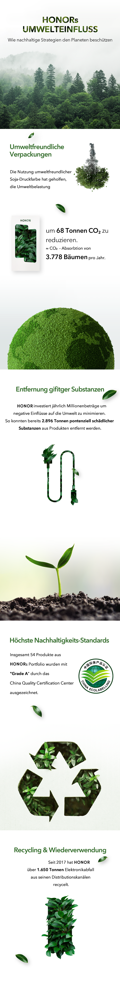 „Bei HONOR verfolgen wir einen nachhaltigen Ansatz für unsere Geschäftstätigkeit. Unser Ziel ist es ein harmonisches Gleichgewicht zwischen Technologieentwicklung und Umweltschutz zu erreichen“, sagte George Zhao, CEO von HONOR Device Co., Ltd. „Wir engagieren uns für die Entwicklung zuverlässiger und innovativer Produkte für unsere Kunden und setzen uns gleichzeitig bewusst für die Erhaltung unseres Planeten ein.“