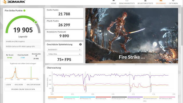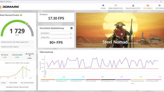 Gerne nehmen wir auch wieder „The Witcher 3: Wild Hunt“ in den Test auf. Zwar ist das Spiel schon ein paar Jahre alt, hat jedoch regelmäßig Updates erhalten und ist immer noch ziemlich fordernd in Sachen Hardware. Hier versuchen wir uns dieses Mal nur mit der Full-HD-Auflösung. Wir wählen die Voreinstellung „High“ – Nvidia HairWorks ist dabei ausgeschaltet. So erreichen wir bis zu 151,1 FPS in der Spitze, während wir als niedrigsten Wert 140,2 FPS ablesen. Im Durchschnitt erreichen wir 145,65 FPS. In der nächsthöheren Detailstufe erreichen wir dann immerhin noch 81,9 FPS und mindestens 77 FPS – im Durchschnitt sind es 79,45 FPS. Auf hohen Details und in der vollen Auflösung des Laptops sind es über 60 FPS im Durchschnitt. Dieses Spiel funktioniert hier wunderbar.