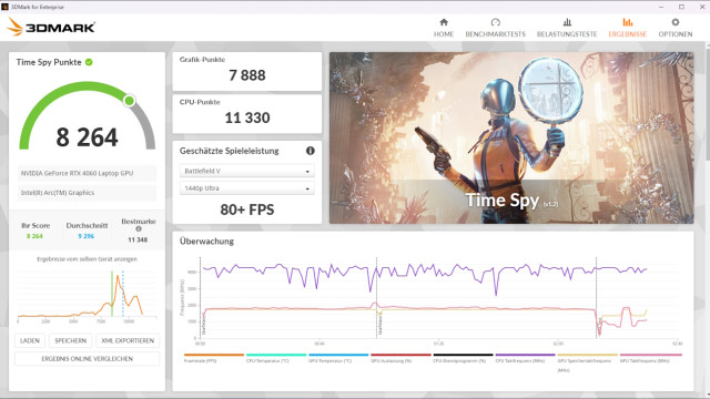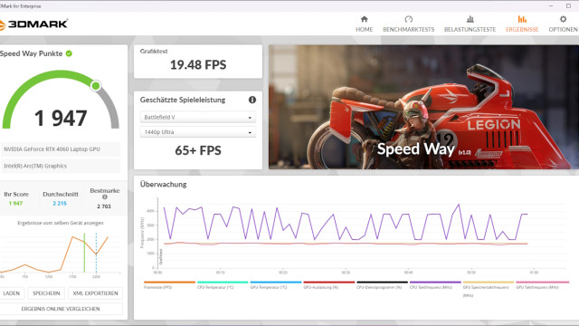 | Grafik | Grafikkarte: NVIDIA GeForce RTX 4060 Laptop Speicher: 8 GB GDDR6 VRAM Kerntakt: 1.470 MHz Speichertakt: 2.000 MHz |