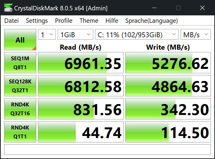 Die Western Digital SN810 hält auch fast die Herstellerangaben ein. Mit bis zu 6.961 MB/s übertrifft sie die angegebene Lese-Leistung um 361 MB/s und bei der Schreibleistung liegt sie mit 5.276 MB/s nur 224 MB/s unter der Angabe. Die SSD sollte für so ziemlich jede Anwendung sein – zumindest in der Geschwindigkeit. Wir würden allerdings bevorzugen, wenn die SSD mindestens 2 TB fassen würde, da der Einbau einer zweiten SSD oder Festplatte nicht möglich ist. Heutige Anwendungen und Spiele nehmen teilweise sehr viel Speicher ein, sodass die verbaute 1 TB-SSD schnell aus den Nähten platzt.