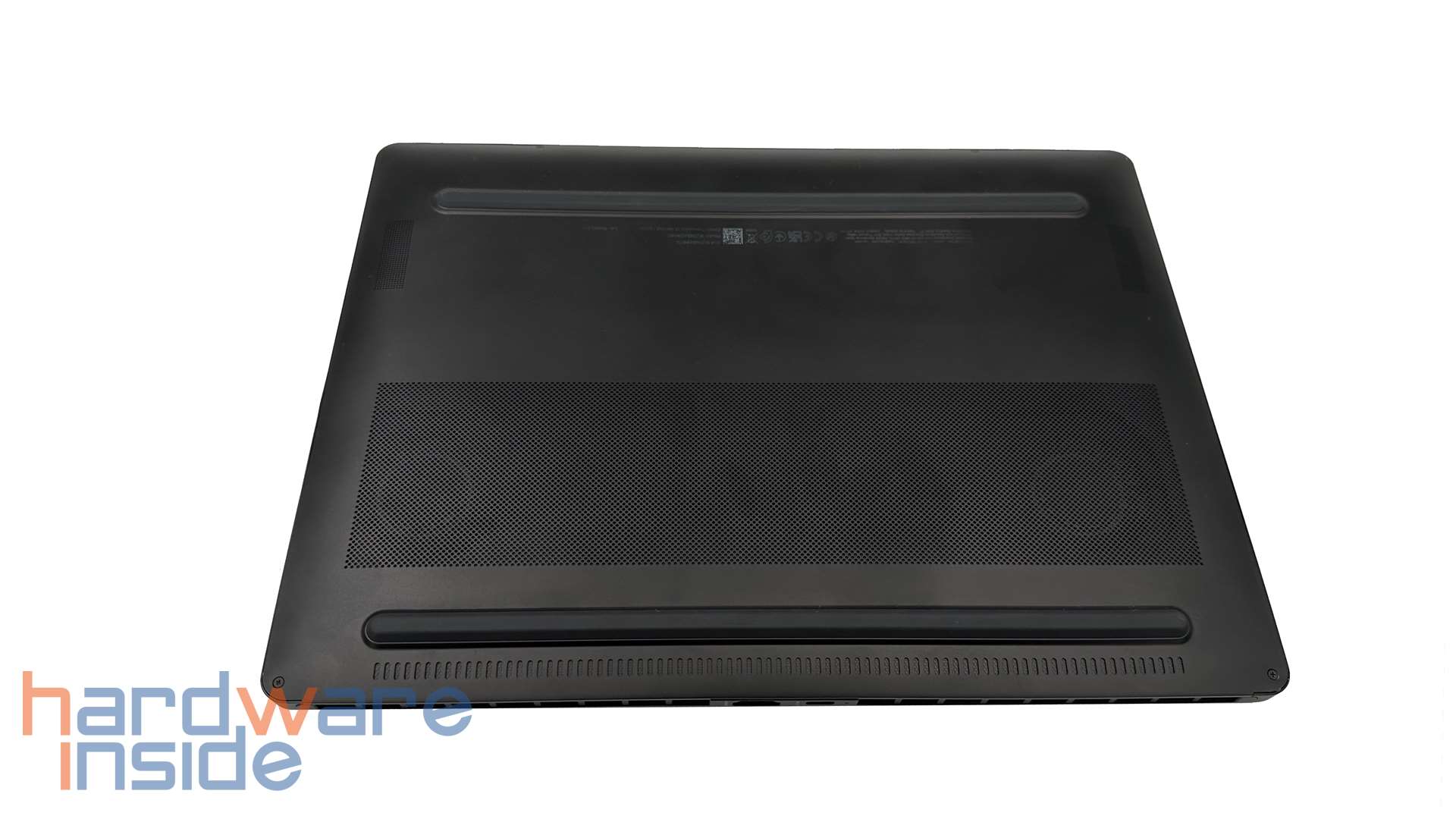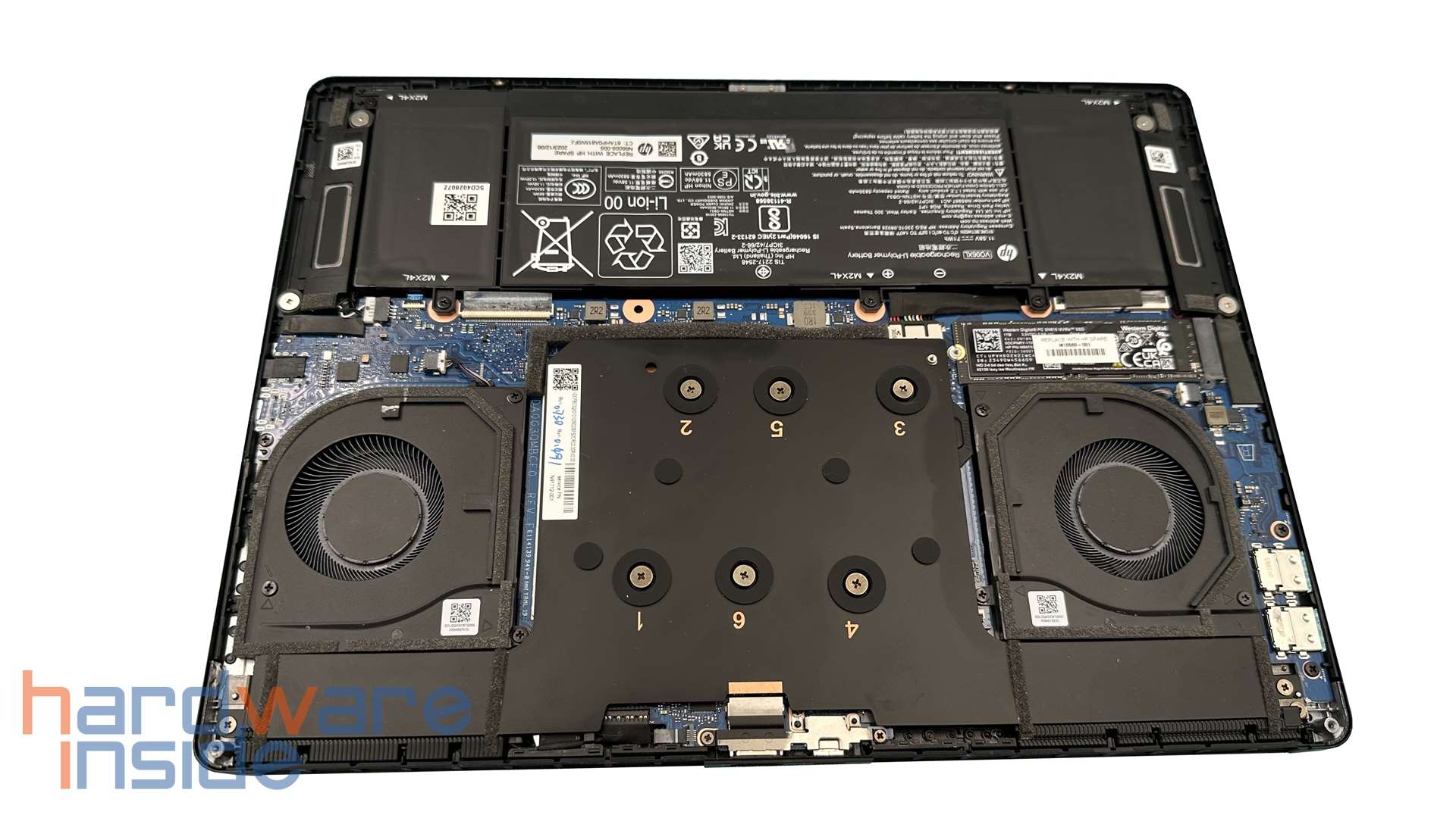 Die Unterseite wird durch vier kleine Schrauben gesichert. Sind diese gelöst, lässt sich die Unterseite am besten mit einer Kunststoffkarte lösen, da diese noch über Clips mit verbunden ist. Im Inneren fällt sofort das große Kühlsystem mit den Zahlen 1 bis 6 auf. Die Zahlen geben an, in welcher Reihenfolge die Schrauben angezogen werden müssen, um Verspannungen beim Befestigen zu verhindern. Unter der Abdeckung befinden sich der Prozessor, der Grafikchip und der Arbeitsspeicher. Alle drei Komponenten sind mit dem Mainboard verlötet, so ist ein Austausch oder ein Upgrade nicht möglich. Die einzigen Komponenten, die sich recht einfach austauschen lassen, sind der Akku, die M.2 SSD und das WLAN-Modul. Die M.2 SSD ist auch im einzigen Anschluss untergebracht, einen weiteren M.2-Anschluss zur Erweiterung des Speichers ist nicht vorhanden.