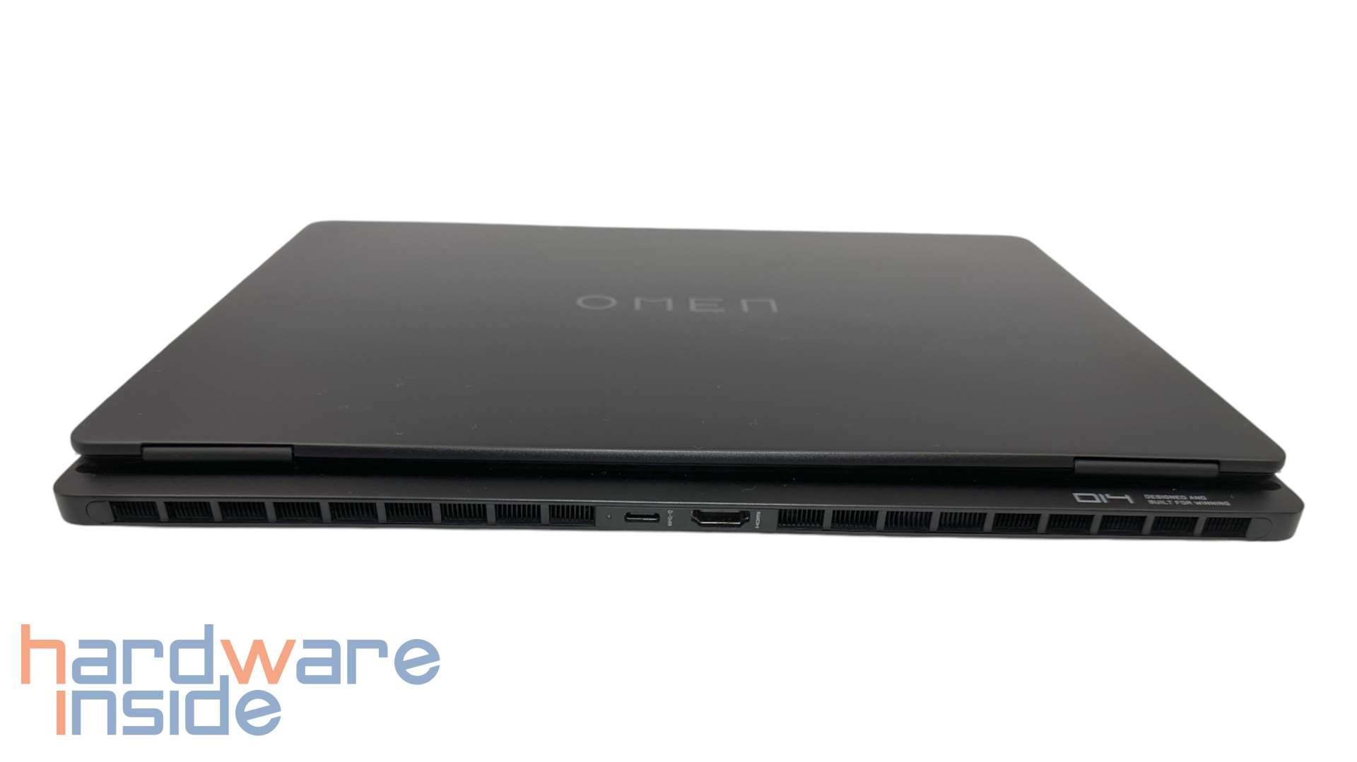 An der Rückseite sind mittig ein HDMI- und ein USB-Typ-C-Anschluss untergebracht. Auch dieser USB-Anschluss unterstützt Power Delivery und DisplayPort 1.4. Links und rechts von den Anschlüssen sind einige große Lüftungsöffnungen zu sehen.