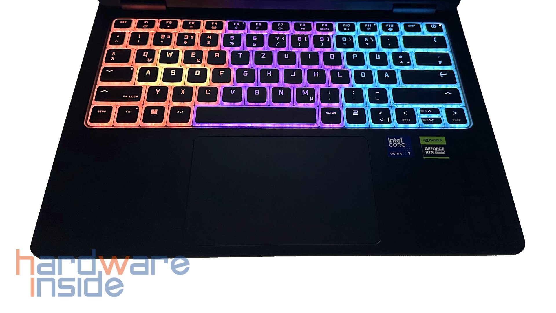 Bei der Tastatur des HP OMEN Transcend 14 Gaming Laptops handelt es sich um eine Tastatur mit flachen Tasten. Dabei sind die Tastenkappen an den Seiten durchsichtig, sodass die Beleuchtung hier noch eindrucksvoller ausfällt. Wir haben hier ein deutsches Layout mit für diese Laptop-Größe recht großen Tasten. Die Beschriftung der Tasten ist sowohl ohne als auch mit Beleuchtung gut ablesbar. Einen Nummernblock gibt es nicht, was eben der Größe geschuldet ist. Dafür fällt das Touchpad sehr großzügig aus. Zu keinem Zeitpunkt haben wir (abgesehen von Spielen & Bildbearbeitung) das Bedürfnis, eine Maus zu nutzen. Die Eingaben werden verzögerungsfrei umgesetzt und der Druckpunkt ist angenehm direkt und knackig.