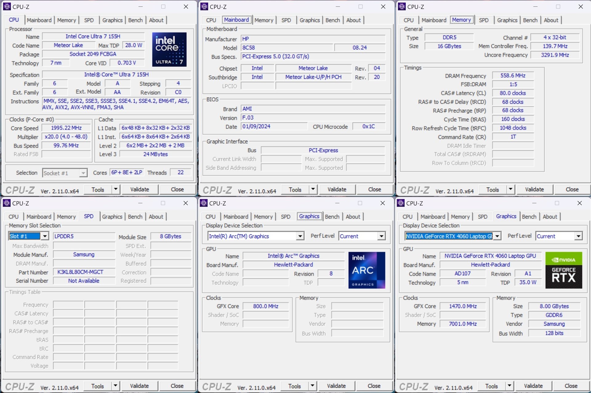 Werfen wir nun einen genaueren Blick auf die Hardware. Wie bereits erwähnt, ist hier ein Intel Core Ultra 7 155H verbaut. Dieser bietet schon eine solide Basis für eine große Breite an Anwendungen. Beim Mainboard handelt es sich um eine Entwicklung von HP selbst, immerhin können wir hier erkennen, dass hier PCIe 5.0 zum Einsatz kommt. Der Speicher ist insgesamt 16 GB groß und besteht aus zwei fest auf dem Mainboard verlöteten Speichern zu je 8 GB. So wird erreicht, dass der Speicher im effizienteren Dualchannel-Modus betrieben wird. Für die Grafik sind eine Intel Arc Graphics, welche ein Bestandteil des Prozessors ist, und eine NVIDIA GeForce RTX 4060 Laptop GPU verbaut. Letztere kommt in der Regel nur zum Einsatz, wenn entsprechende Leistung abgerufen wird. Ansonsten übernimmt die sparsamere Intel Arc Graphics GPU.