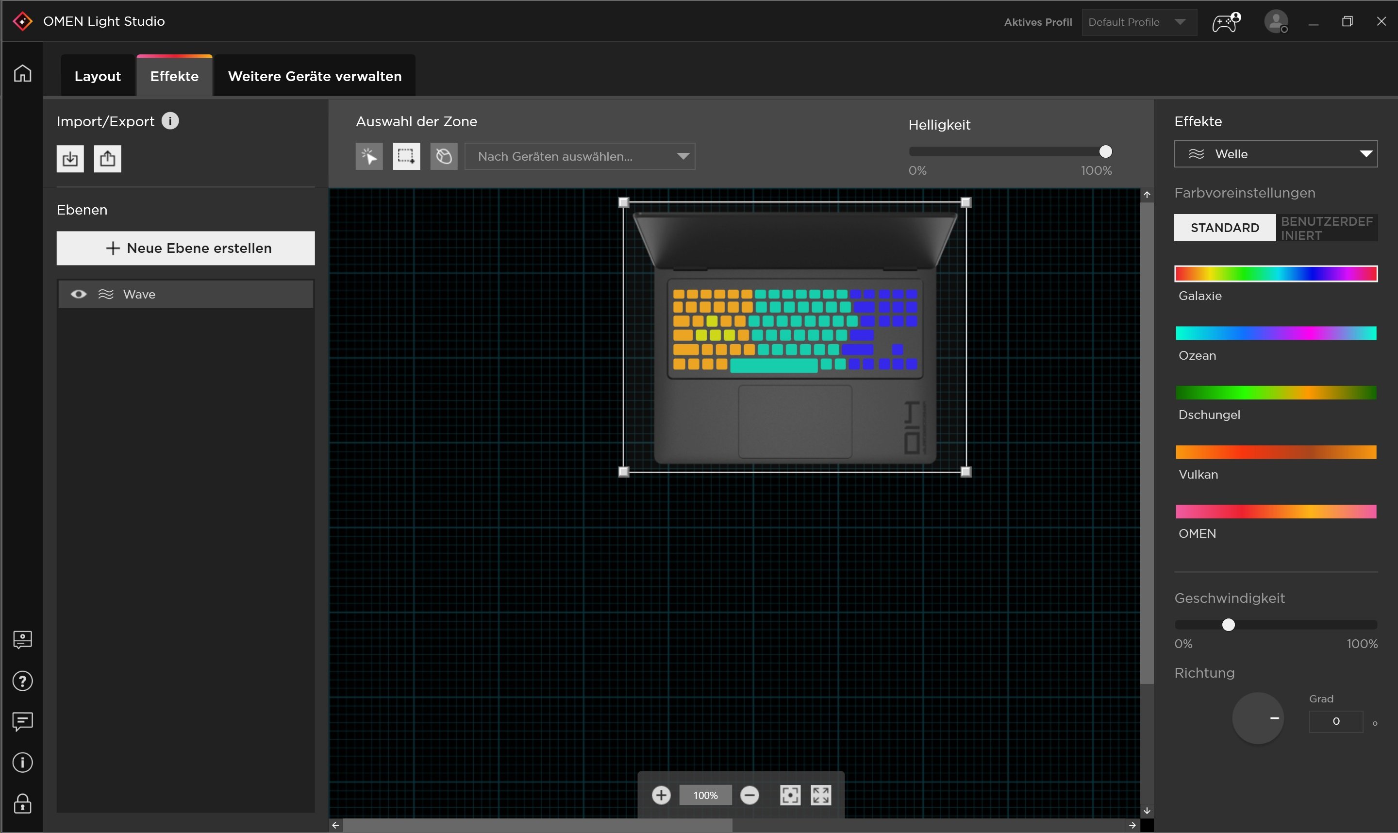 Das OMEN Light Studio ist ein Bestandteil des HP OMEN Gaming Hub, welcher allerdings noch installiert werden muss. In dieser Software kann man sich bezüglich der Beleuchtung der Tastatur so richtig austoben, da eine Vielzahl an Farben und Effekten zur Verfügung stehen. Es lassen sich auch eigene Effekte festlegen und speichern. Jede Taste kann in einer eigenen Farbe eingestellt werden. Natürlich sind auch Helligkeit und Geschwindigkeit des jeweiligen Effekts einstellbar. Weiter kann hier nicht nur die Tastaturbeleuchtung, sondern auch die von kompatibler Hardware gesteuert werden.