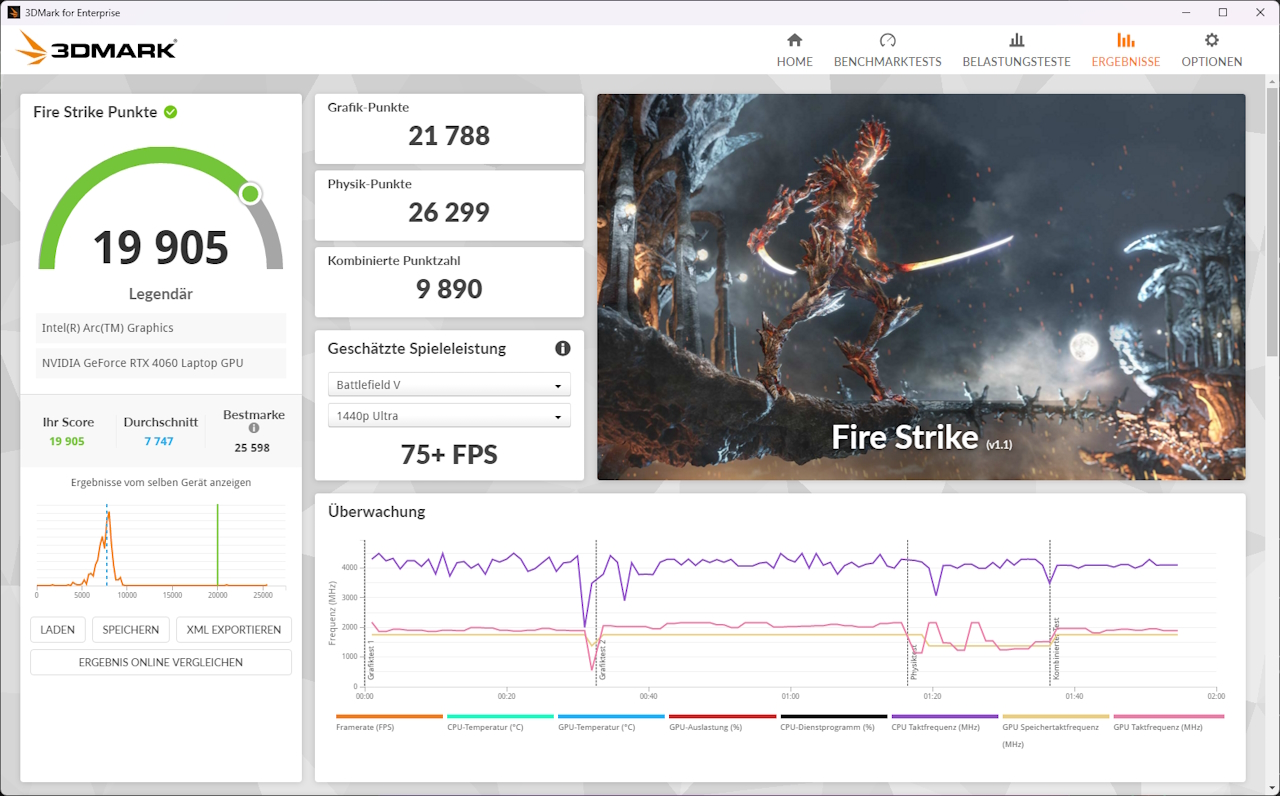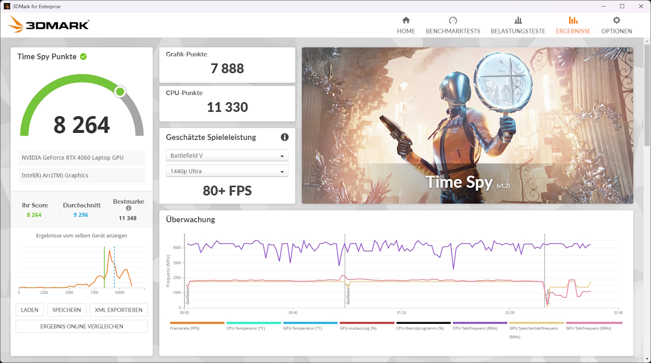 | Grafik | Grafikkarte: NVIDIA GeForce RTX 4060 Laptop Speicher: 8 GB GDDR6 VRAM Kerntakt: 1.470 MHz Speichertakt: 2.000 MHz |