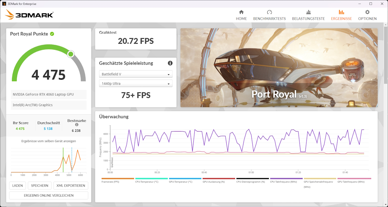 Die Grafik-Benchmarks aus der 3DMARK Suite zeigen schon eine ungefähre Richtung, wohin es mit der Leistung geht. Während des Tests betreiben wir den Laptop im Modus „Leistung“, welchen wir im HP OMEN Hub einstellen. In den Standard-Einstellungen der Benchmarks werden diese in der Auflösung 1.920 x 1.080 Pixel (Full-HD) wiedergegeben. In dieser Auflösung würden demnach auch die meisten Games mit mittleren bis zu hohen Details flüssig laufen. Ob dem wirklich so ist, werden wir uns nachher noch genauer ansehen.