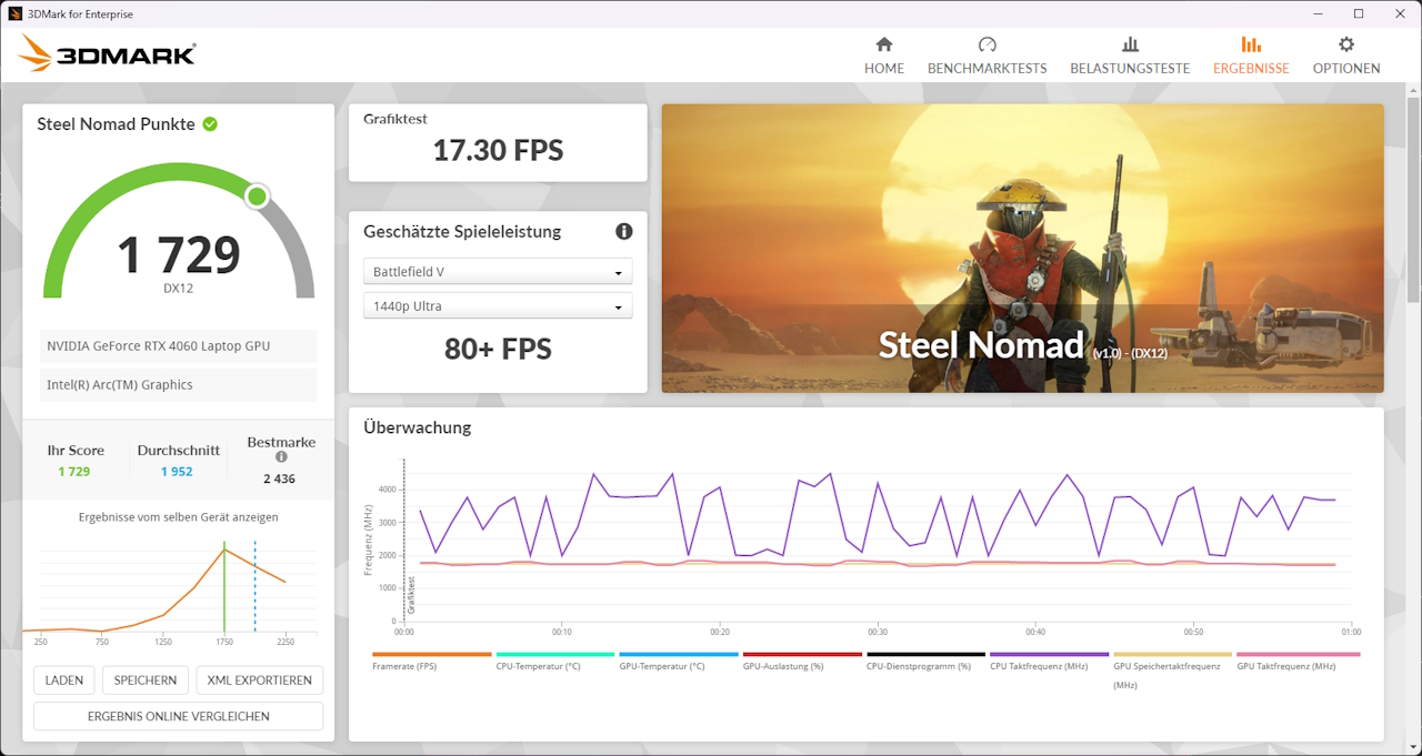Gerne nehmen wir auch wieder „The Witcher 3: Wild Hunt“ in den Test auf. Zwar ist das Spiel schon ein paar Jahre alt, hat jedoch regelmäßig Updates erhalten und ist immer noch ziemlich fordernd in Sachen Hardware. Hier versuchen wir uns dieses Mal nur mit der Full-HD-Auflösung. Wir wählen die Voreinstellung „High“ – Nvidia HairWorks ist dabei ausgeschaltet. So erreichen wir bis zu 151,1 FPS in der Spitze, während wir als niedrigsten Wert 140,2 FPS ablesen. Im Durchschnitt erreichen wir 145,65 FPS. In der nächsthöheren Detailstufe erreichen wir dann immerhin noch 81,9 FPS und mindestens 77 FPS – im Durchschnitt sind es 79,45 FPS. Auf hohen Details und in der vollen Auflösung des Laptops sind es über 60 FPS im Durchschnitt. Dieses Spiel funktioniert hier wunderbar.