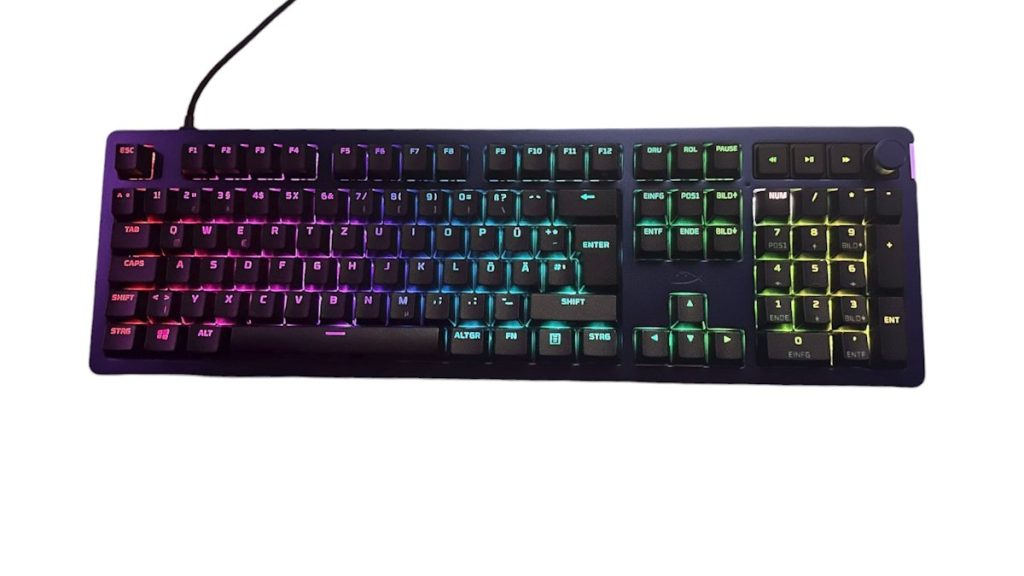 Die HyperX Alloy Rise macht sich mit der blauen Abdeckung und der Beleuchtung sehr gut auf unserem Schreibtisch. Als Unterlage dient eine Cherry GP5 XL-Mausmatte in Design „Amnis Blue“. Ganz typisch für Tastaturen mit PBT-Tastenkappen (ausgenommen Sonderformen wie Pudding) ist die Beleuchtung etwas dunkler als es bei ABS-Tastenkappen der Fall ist. Dennoch sind alle Beschriftungen gut abzulesen. Erst jetzt fällt uns allerdings auf, dass gerade die ersten beiden Tasten der ersten Reihe der Funktionstasten wohl nicht ausreichend Platz für die Beschriftung haben. Statt „DRUCKEN“ und „ROLLEN“ steht dort „DRU“ und „ROL“. Diese abgekürzte Form wirkt etwas unschön, hier hätte HyperX lieber auf eine kleinere Schriftart setzen sollen. Ansonsten ist die Beleuchtung schön anzusehen und bringt schon ab Werk viele Effekte mit sich. Wer sich austoben will, kann jeder Taste eine eigene Farbe verpassen – ganz nach Belieben.
