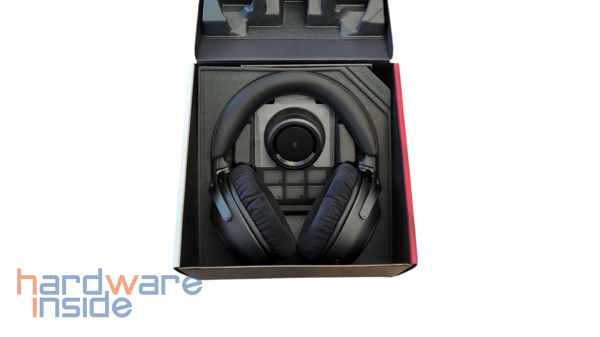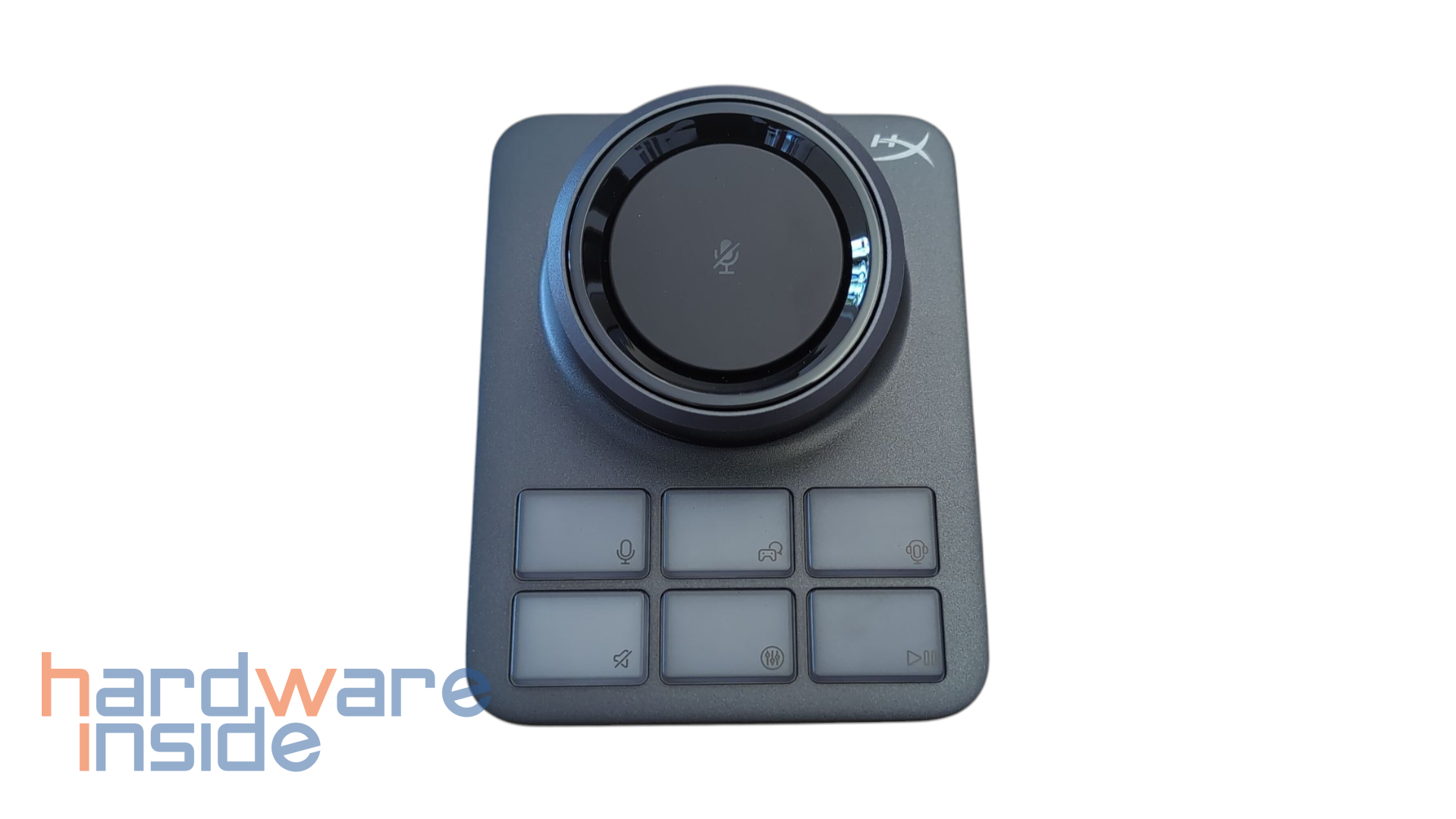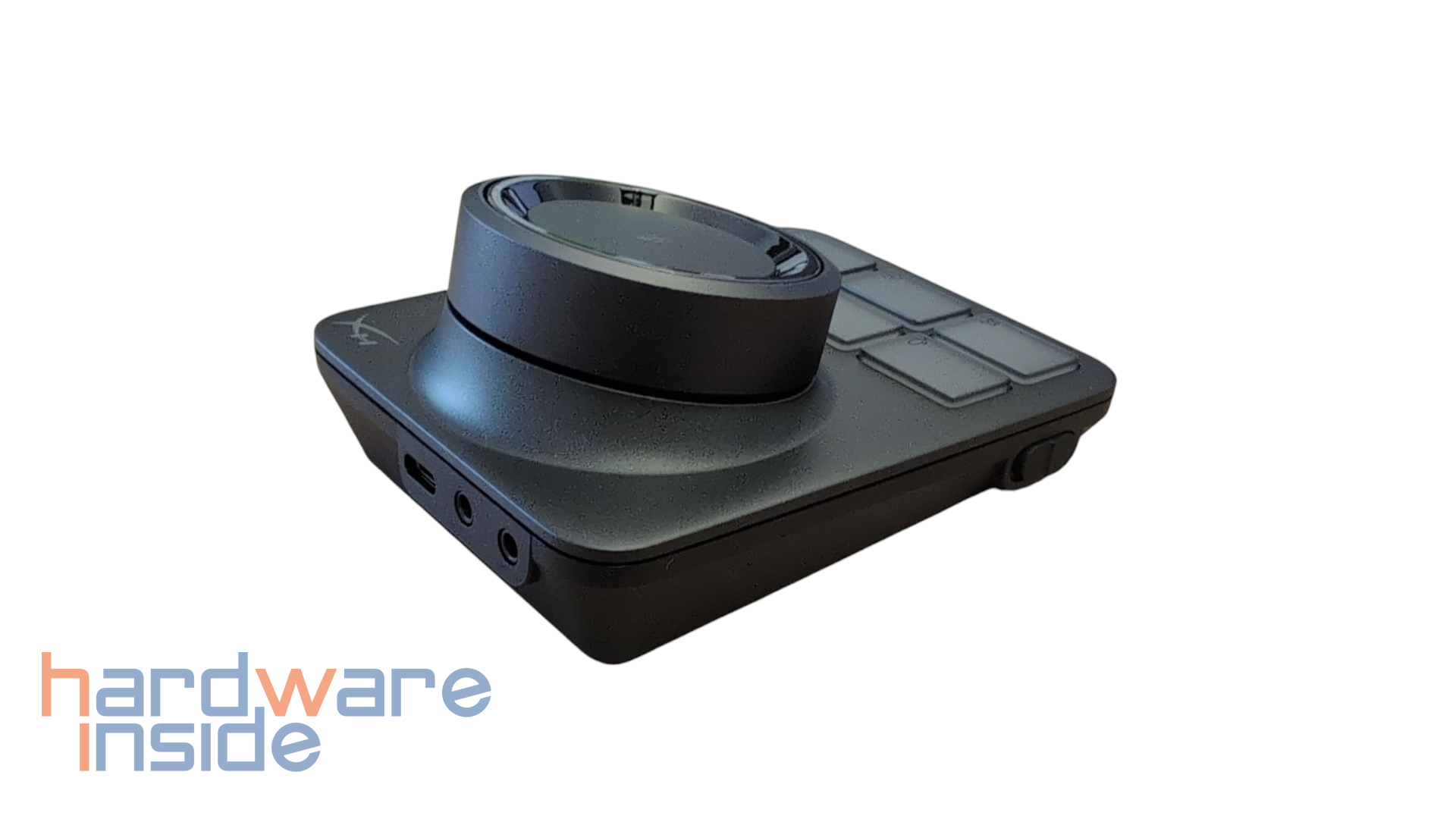 Die Basisstation präsentiert sich in einem modernen, matten Design. Oben rechts ist das HyperX-Logo platziert. Im oberen Bereich dominiert ein großzügig dimensionierter, drehbarer Lautstärkeregler, der leicht erhöht sitzt und von einem LED-Ring eingefasst ist. Dieser Ring dient zur visuellen Rückmeldung von Statusinformationen. Zentral im Regler befindet sich zudem ein gut erreichbarer Druckknopf, der für die Stummschaltung des Mikrofons gedacht ist. Direkt darunter sind sechs Tasten in zwei Reihen angeordnet. Sie sind hintergrundbeleuchtet und mit eindeutigen Symbolen versehen, die auf die jeweiligen Funktionen hinweisen. Diese sind jedoch über Software frei konfigurierbar und lassen sich nach Belieben anpassen. Auf der Rückseite sind ein USB-C-Anschluss, ein 3,5 mm Line-Out-Anschluss sowie ein 3,5 mm Line-In-Anschluss. Mit dem Schalter auf der linken Seite kann dann zwischen Line-Out und Headset gewechselt werden.