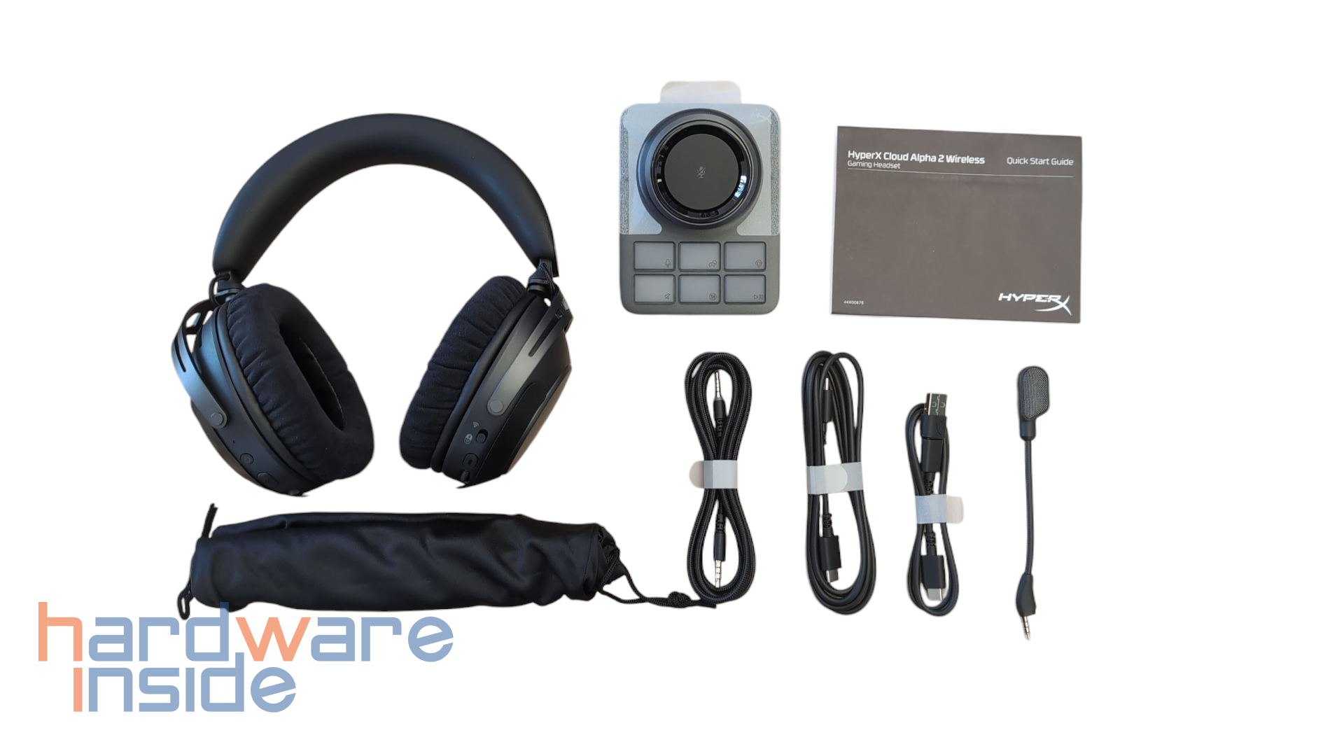 Neben dem HyperX Cloud Alpha 2 Wireless Headset finden wir die Basisstation mit USB-Typ-C Anschluss sowie das abnehmbare Mikrofon. Dazu gibt es zwei USB-C zu USB-C-Kabel, ein USB-C auf USB-A-Adapter und ein 3,5-mm-Headset-Audiokabel. Außerdem liegen ein Stoffbeutel sowie die Bedienungsanleitung bei.